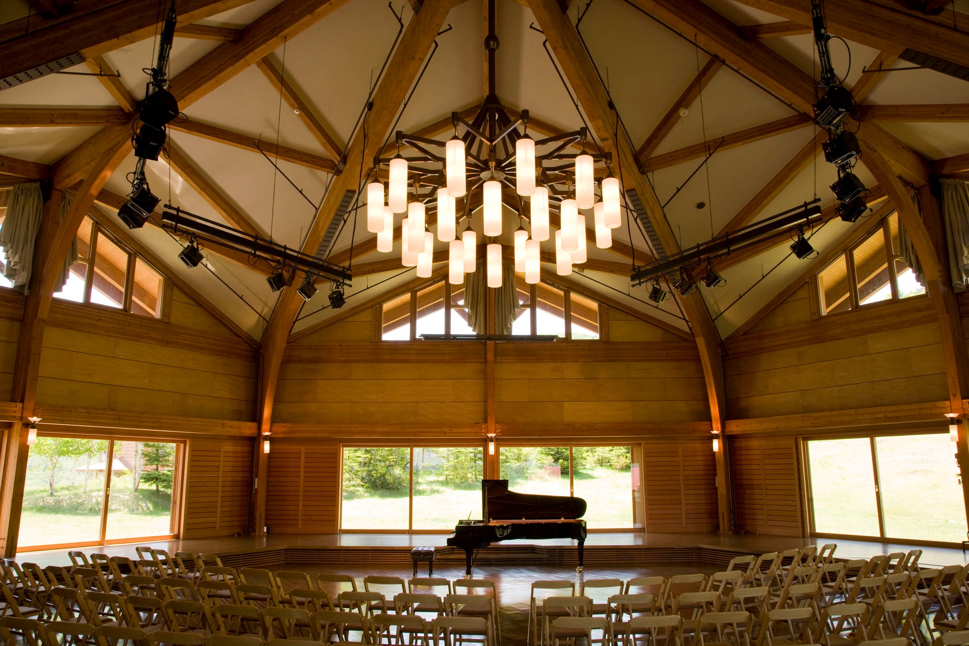 奥志賀高原は、標高1,500メートルの澄み切った空気と豊かな森に包まれた特別な地。ここ「森の音楽堂」は、雪の結晶をモチーフに設計された六角形の木造ホールで、演奏者の息遣いまでも感じ取れるほど観客との距離が近く、柔らかくも力強い音色が空間全体に美しく響きわたります。