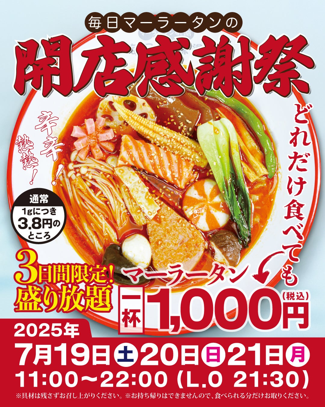 四川の本格薬膳スープ麻辣湯の専門店『毎日マーラータン』(所在地:茨城県つくば市天久保2-11-10)では、2025年7月19日(土)〜21日(月・海の日)の3日間、開店100日間を超えた記念として、開店感謝祭「3日間限定!1000円で盛り放題」キャンペーンを開催いたします。