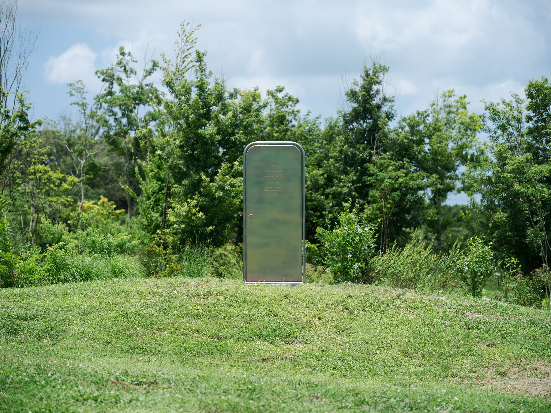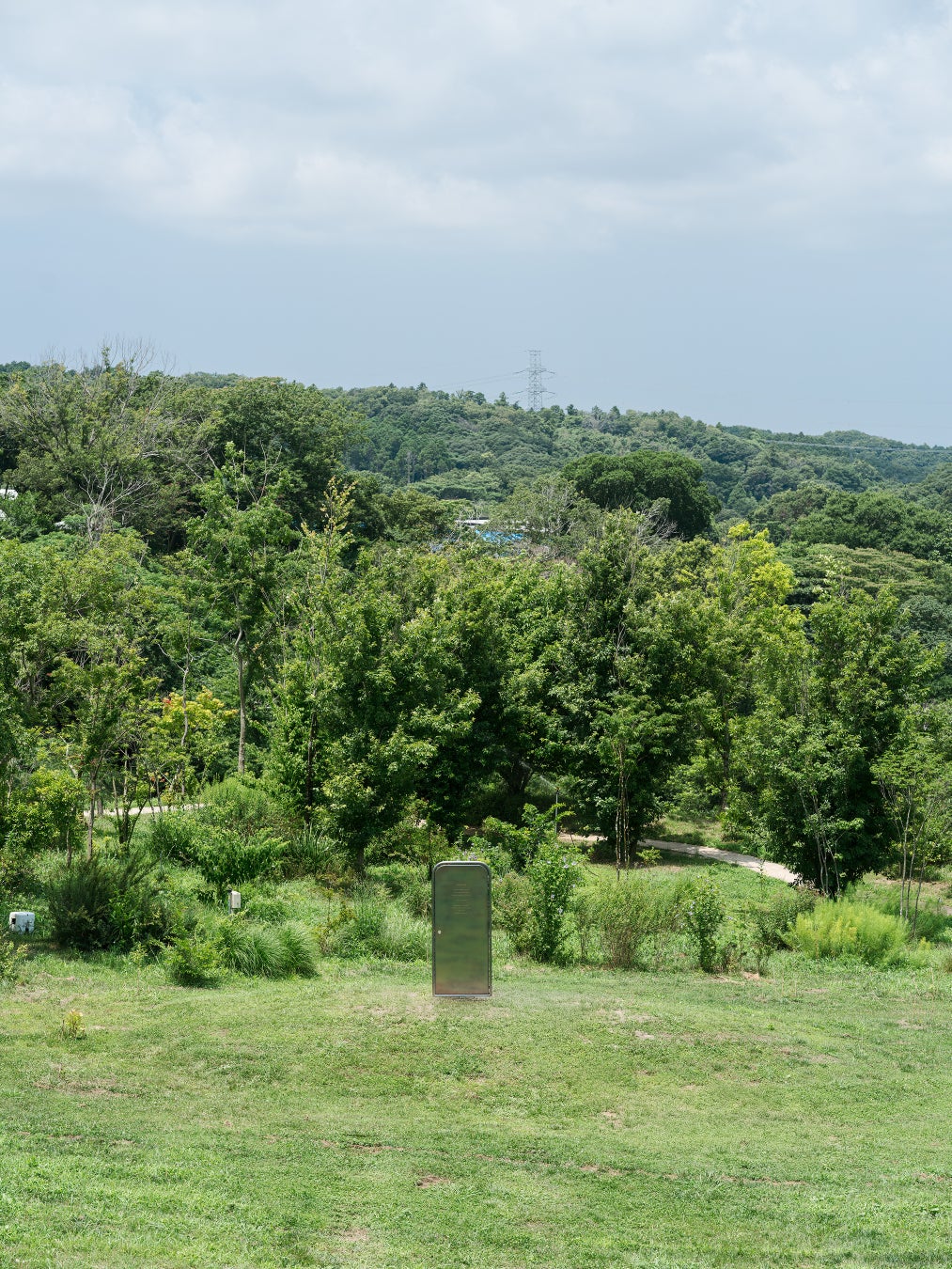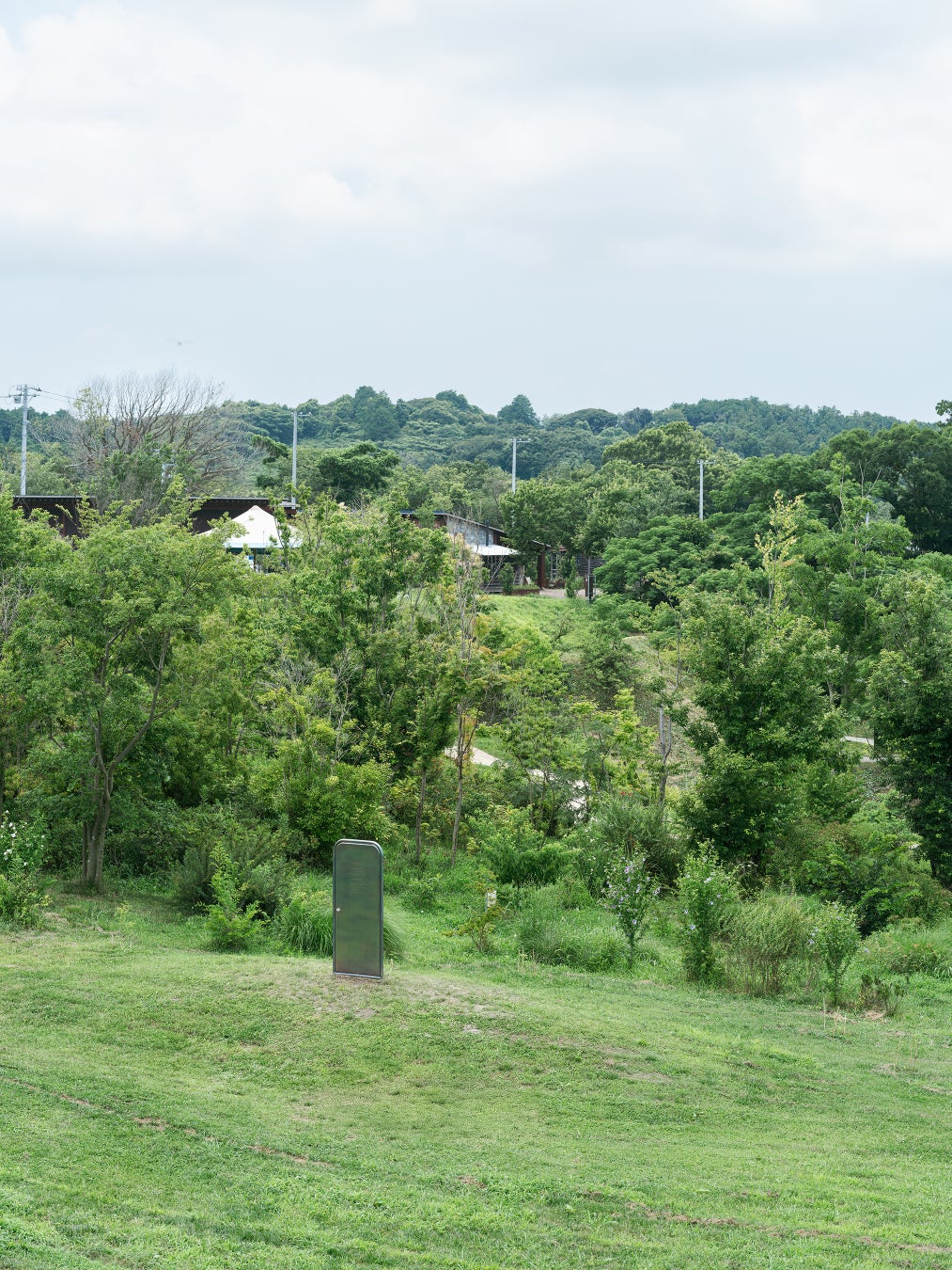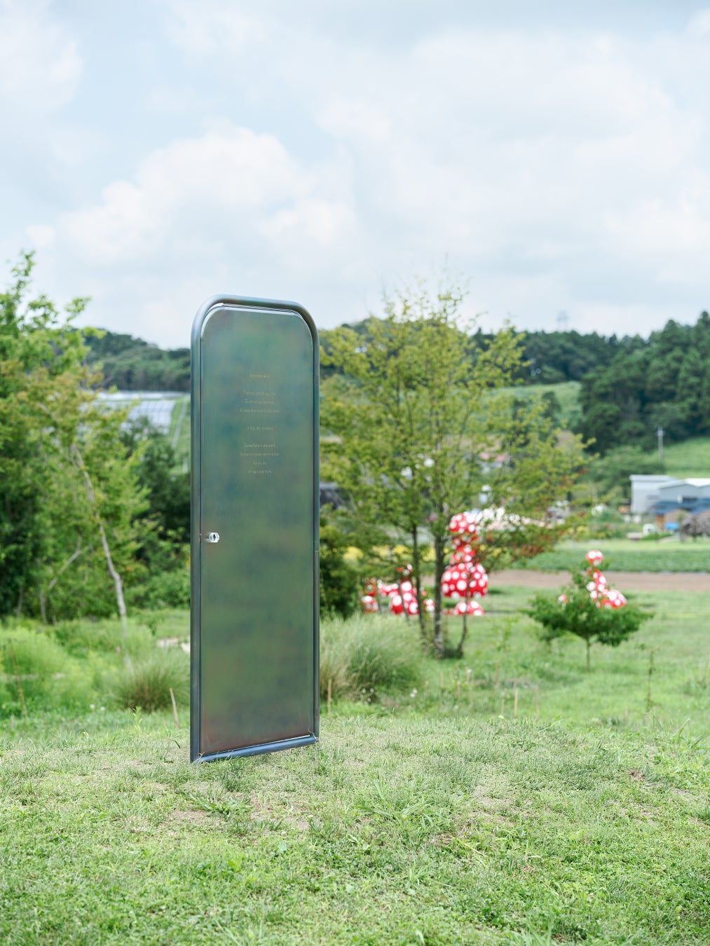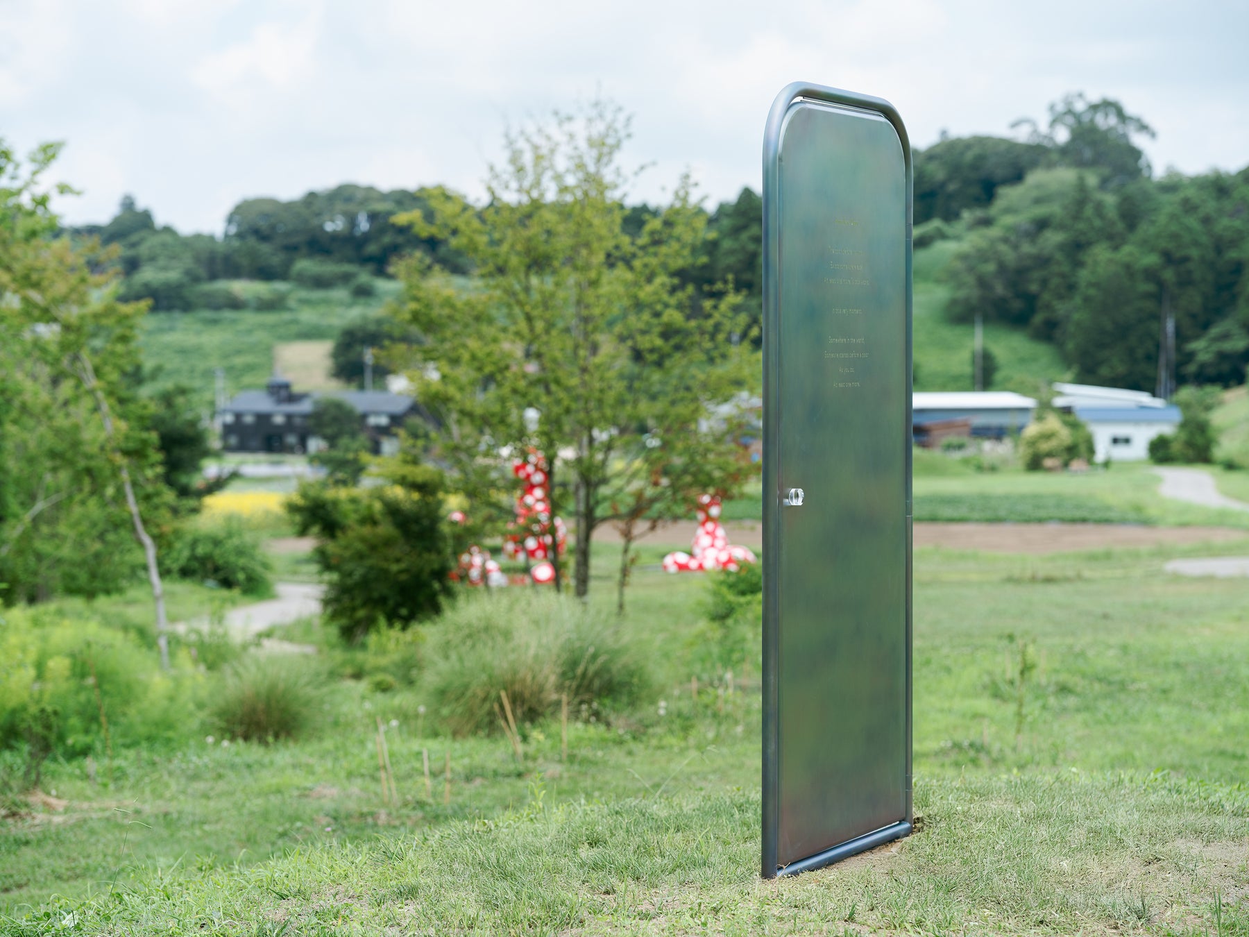 常設での屋外展示となることから、鉄筋コンクリート基礎が施工され、ドアを固定しました。KURKKU FIELDS という場所の持つ素晴らしさのひとつが子どもから大人まで楽しみ学べることであると感じたことから、遊具と屋外アート作品の中間のような存在になれるよう工夫して、見通しの良い開けた場所でかつ気軽に近づけるような設置場所を選定しました。背後には緑が広がっており、100年後も風景とともにあるような作品となるよう園内の様々な場所からの見え方も同時に考慮しています。
