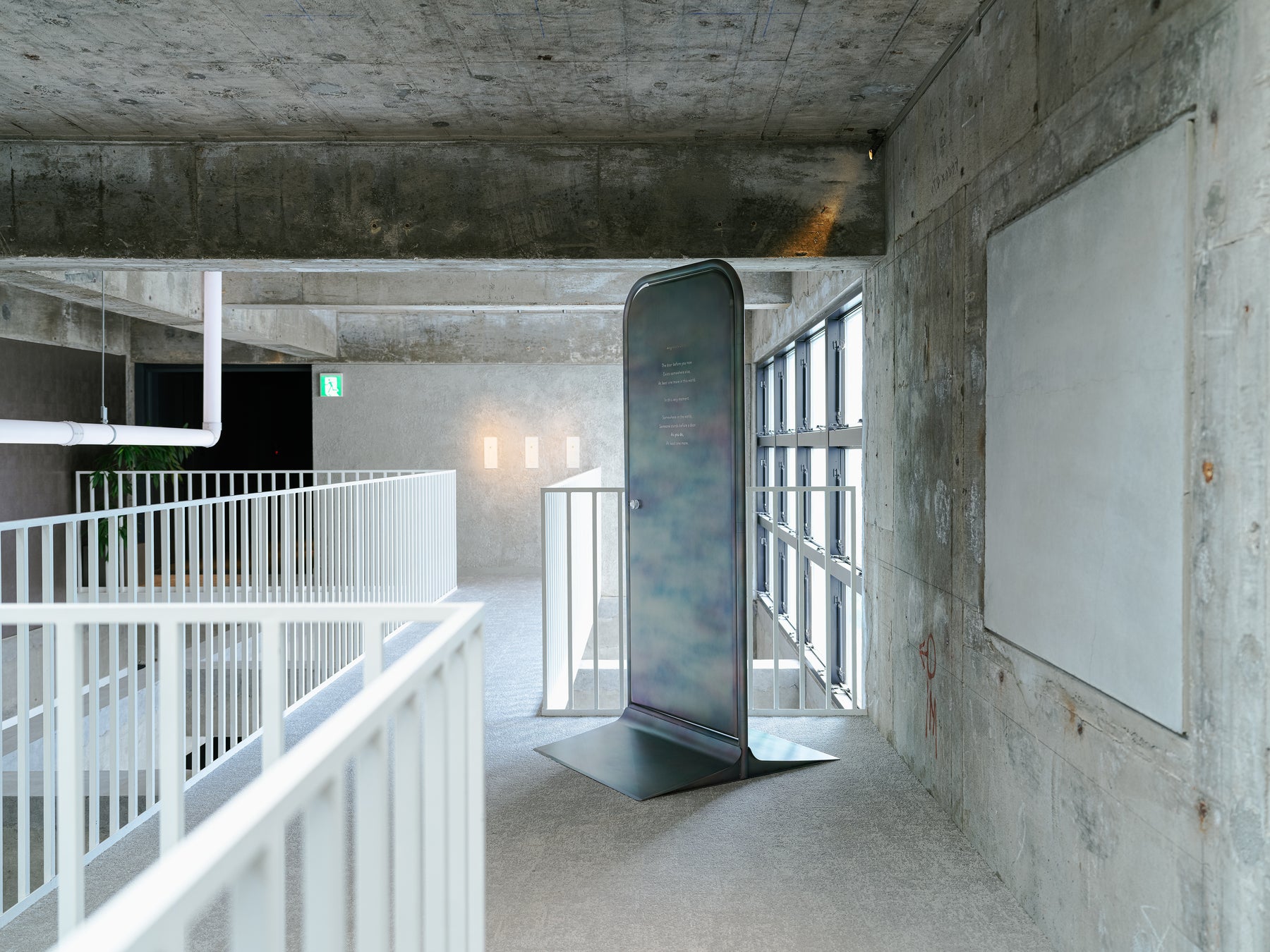 《Anywhere Door》4箇所のうち、唯一の屋内作品となることから、床の仕上面のカーペットと自然に作品がつながるよう工夫して、曲面状に立ち上げる脚部を設計 / 制作しました。白井屋ホテルのヘリテージタワーは、屋内空間ではあるものの、都市的な体感とスケールを持つ美しい街のような空間だと思います。そんな「街」の一部 になりつつ、この場所から出発したり辿り着いたりするような物語を感じられる設置場所を選定しました。