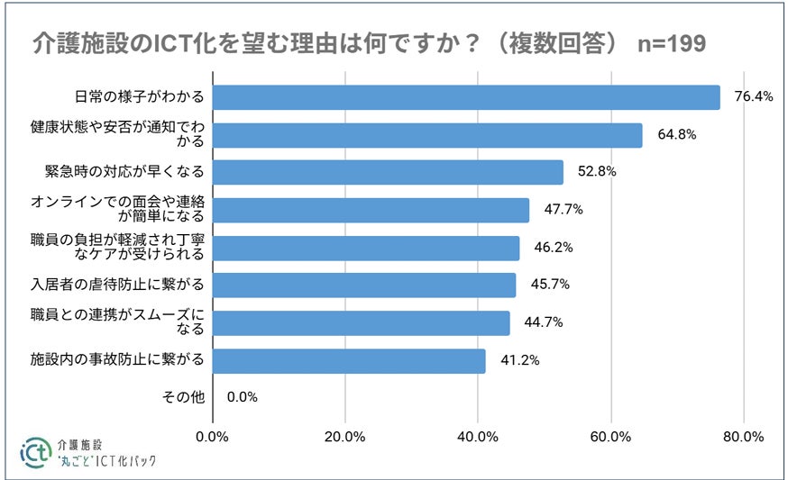 介護施設のICT化を望む理由としては、「日常の様子がわかる(76.4%)」「健康状態や安否が通知でわかる (64.8%)」「緊急時の対応が早くなる(52.8%)」が上位となった。