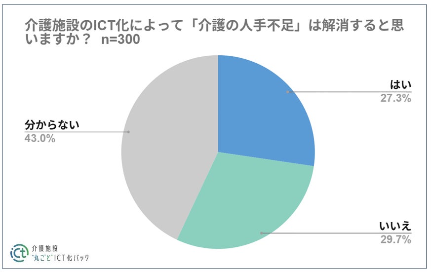 介護施設のICT化によって『介護の人手不足』は解消すると思うかどうかという問いに関して、「はい (27.3%)」「いいえ(29.7%)」「分からない(43.0%)」という結果だった。