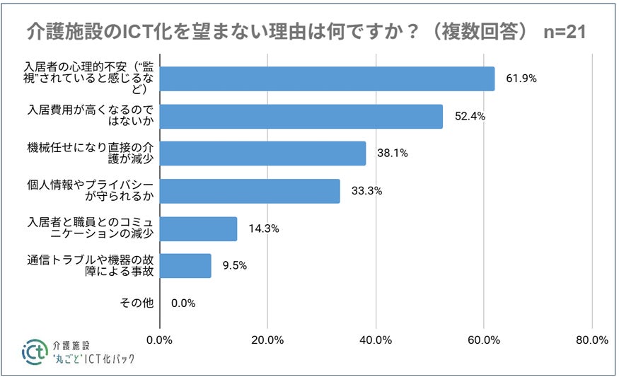 ・一方、介護施設のICT化を望まない理由としては、「入居者の心理的不安(“監視”されていると感じるなど) (61.9%)」「入居費用が高くなる(52.4%)」「機械任せになり直接の介護が減少(38.1%)」が上位となった。