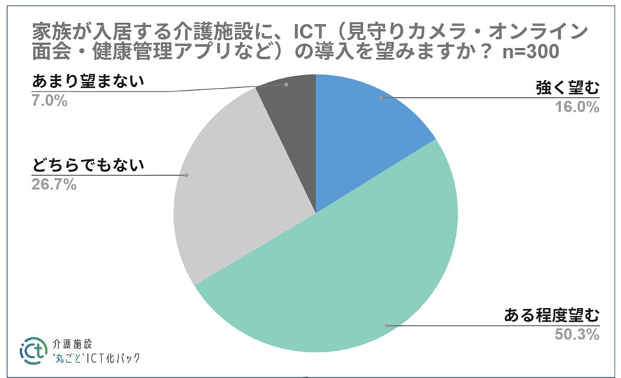 家族が入居する介護施設に、見守りカメラ・オンライン面会・健康管理アプリなどのICT導入を望むかどうかの問いに、「強く望 む(16.0%)」「ある程度望む(50.3%)」「どちらでもない(26.7%)」「あまり望まない(7.0%)」と、ICTを望む声が約 7割となった。