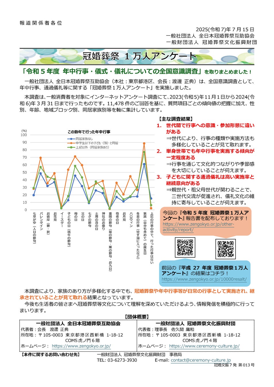 一般社団法人全日本冠婚葬祭互助協会(本社︓東京都港区、会長︓渡邊 正典)は、全国意識調査として、年中行事、通過儀礼等に関する「冠婚葬祭1万人アンケート」を実施しました。