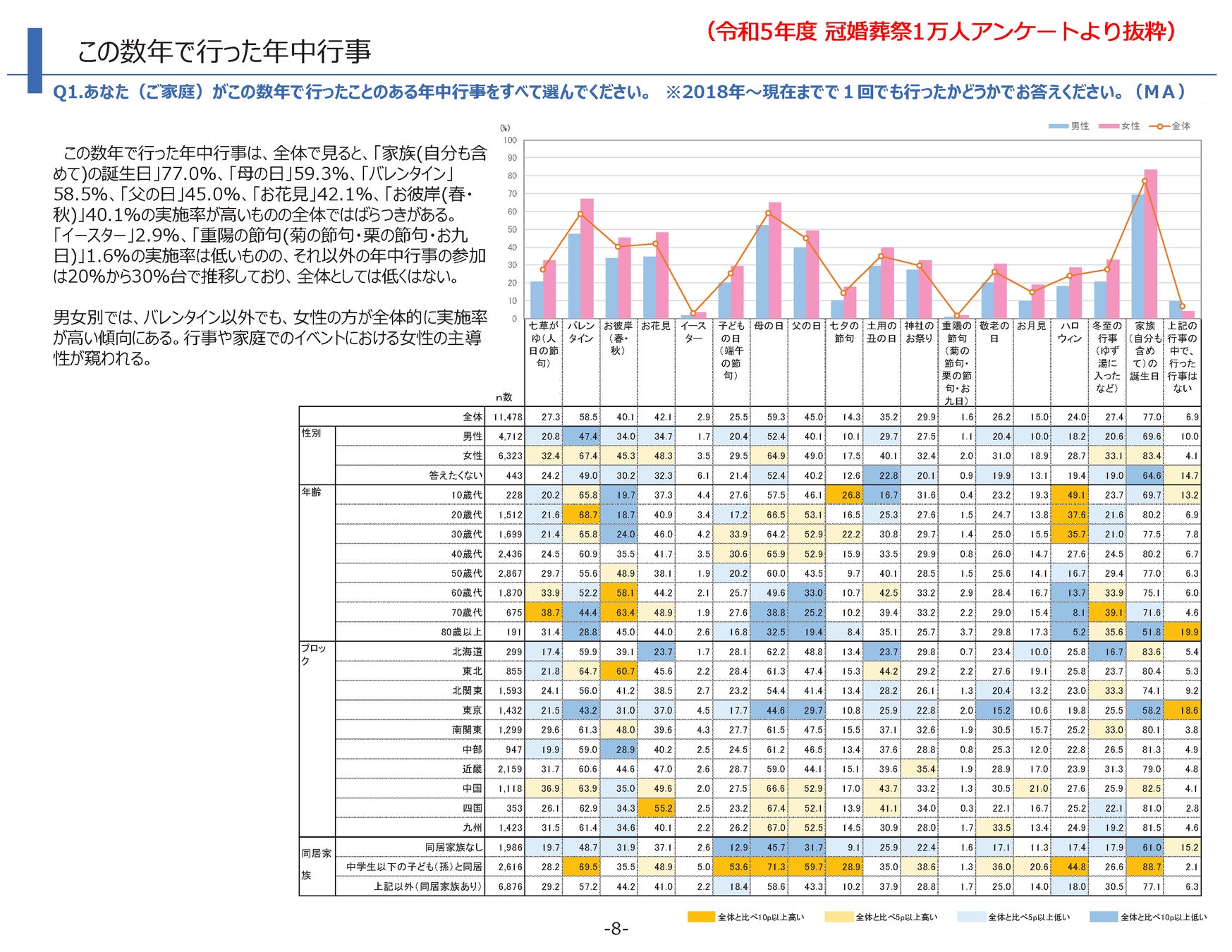 本調査により、家族のあり方が多様化する中でも、冠婚葬祭や年中行事等が日常の行事として実施され、継承されていることが見て取れる結果となっています。
