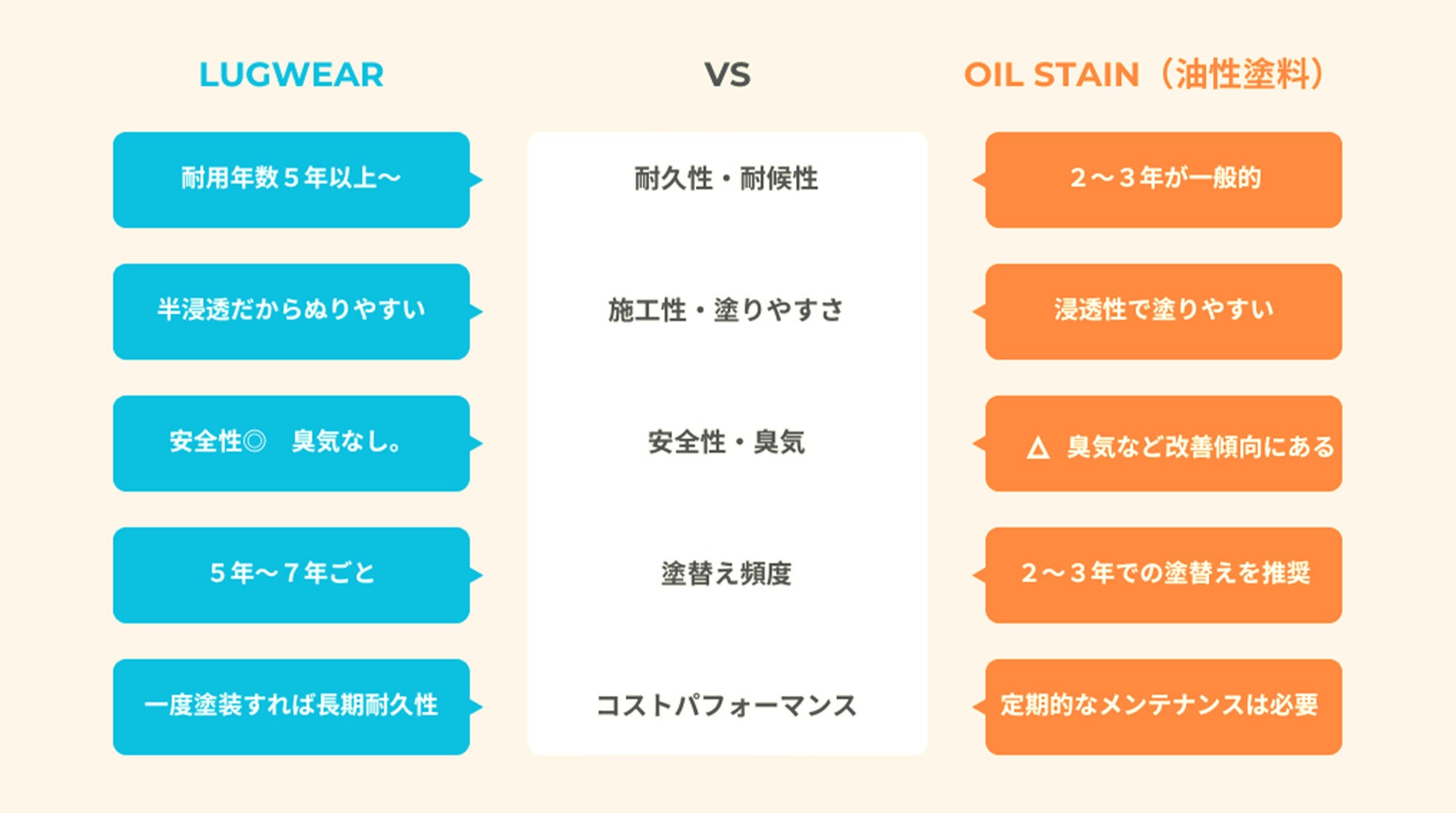 LUGWEARの1番の特徴は塗料自体の高い耐久性です。特に色の変化と防水性に対してです。一般的な塗料では数年で色が変わってしまいお客様の仕上がりイメージから離れてしまうことになります。また水が浸入するということは基材となる木材の劣化が進みます。