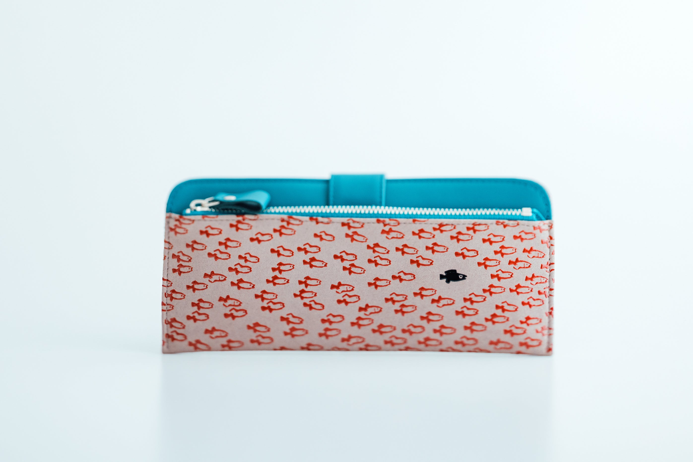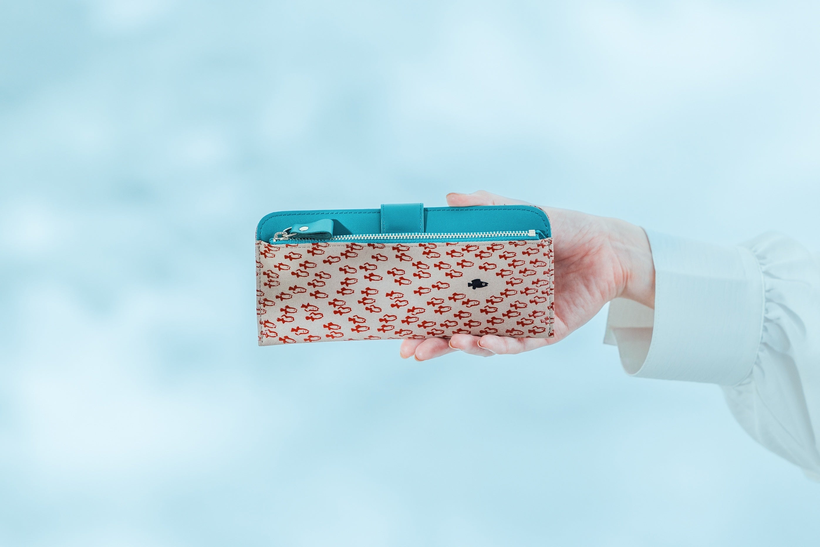 「スイミー」とのコラボレーション商品は、小銭入、がま口、束入(長財布)、名刺入、パスケース、ポーチ、ミラーの全7種類。柔らかなグレージュの鹿革に、小さな赤い魚たちと黒いスイミーを、艶やかで立体感のある漆で生き生きと表現しました。本リリースでは、コラボ背景や、商品へのこだわりについても明かします。