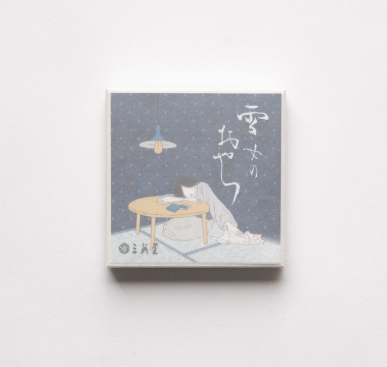 パッケージは、雪のように白い小箱に”くつろぐ雪女”を描いたしおりを2パターン作成。