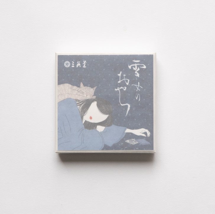 『雪女』は、巳之吉が若い頃に雪女と遭遇し秘密を守るよう誓わされるも、結婚後にうっかり話してしまい、雪女である妻は姿を消してしまう異類婚姻譚です。禁忌を破られた雪女は、愛する者の前から消え去る運命にあります。この幻想的な怪談話にインスピレーションを受け、雪女のおやつは開発されました。