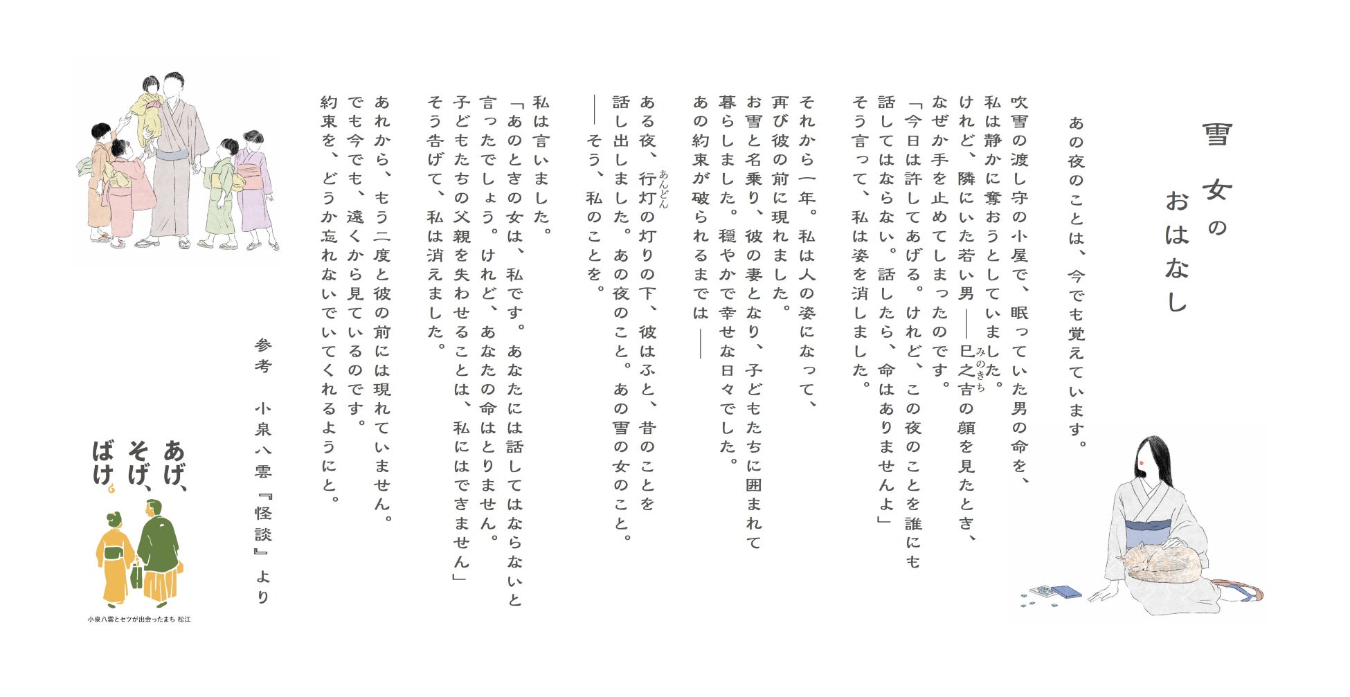 また『雪女』を”雪女視点”で再構成したお話も載せています。こちらの監修は小泉八雲研究に取り組んでおられる、島根大学法文学部 准教授 宮澤文雄先生にお願いいたしました。