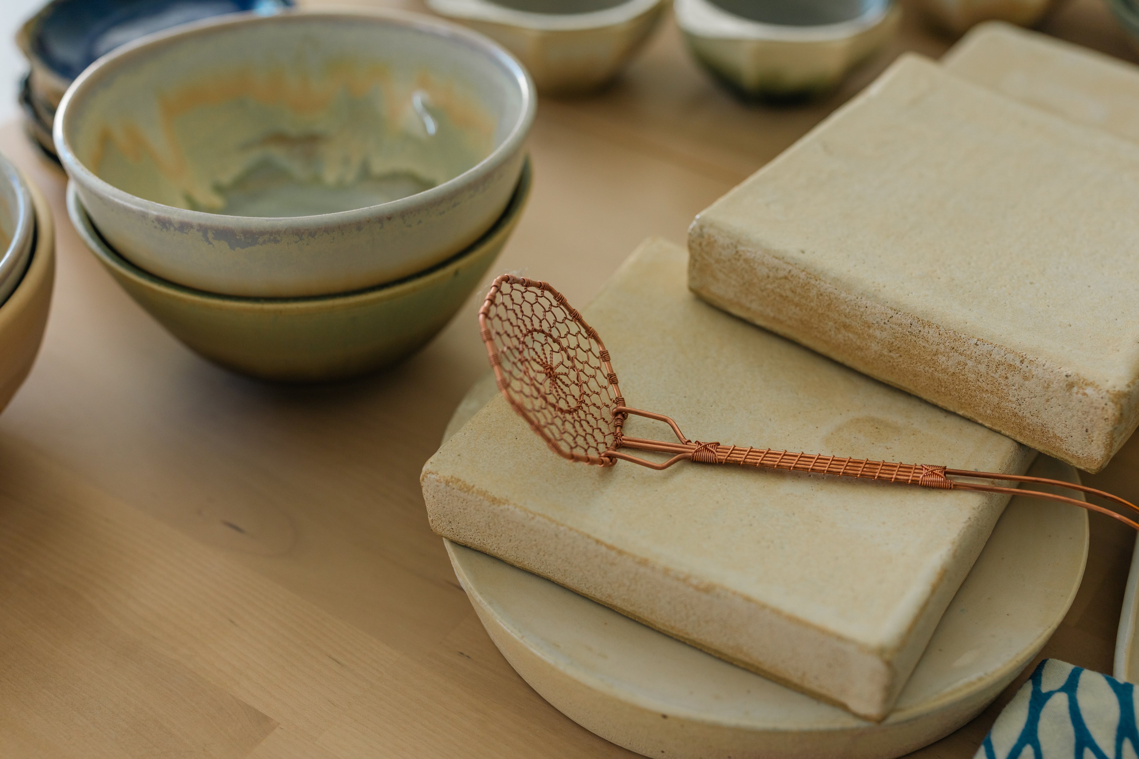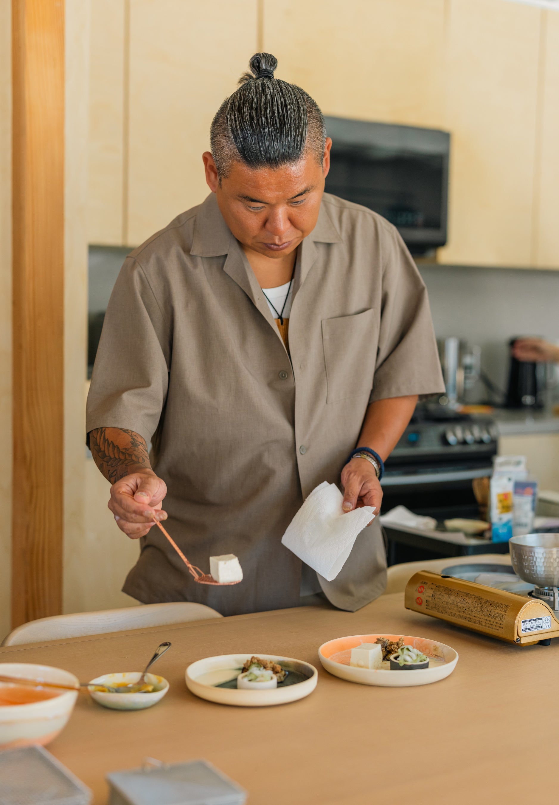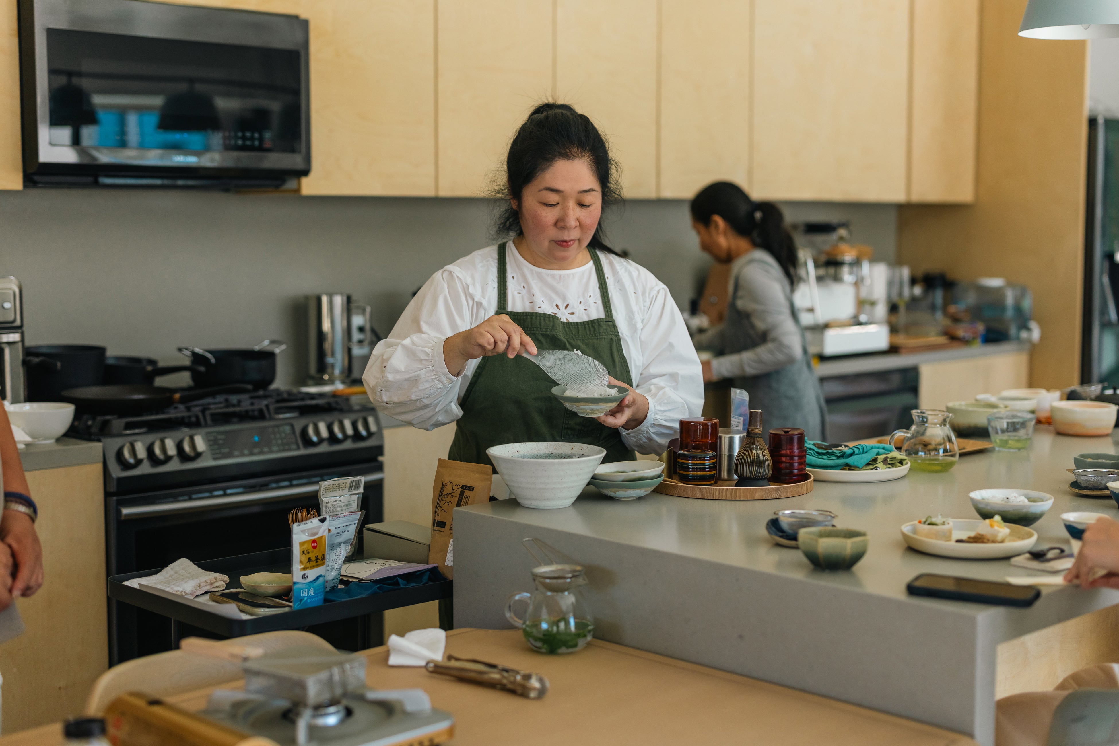 本イベントは、華やかなエンターテインメントとは一線を画し、「静かな儀式(Quiet Rituals)」としての日本茶の体験を、日本の道具とカリフォルニアの旬の食材を通じて再構築する試み。中心となったのは、金網つじ製の調理道具や同社のスタートともなった菊モチーフを施したの豆腐掬い、そして金網つじオリジナルサークル・ティー・インフューザーに合わせてロサンゼルスの建築スタジオOWIUが特別にデザインした八角形のティーカップ。参加者は、自らの手でインフューザーを使ってお茶を淹れ、その一杯を静かに味わった。