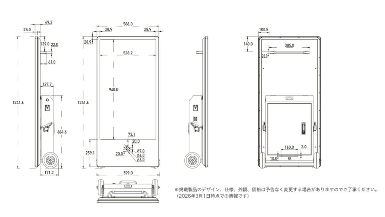 本製品は、「サイネージを導入したいが設置工事が大変」「屋外で電源やネット環境がない」「運用が難しそう」という現場の課題を解決する完全コードレス型モバイルサイネージです。キャスター付きで移動が簡単、届いたその日から誰でも簡単に設置・運用可能です。
