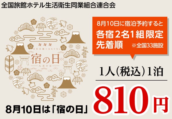 全国旅館ホテル生活衛生同業組合連合会に加盟している施設の中から全国33の施設を対象に、お一人さま810円(税込)で予約できるお得なプランを限定販売します。