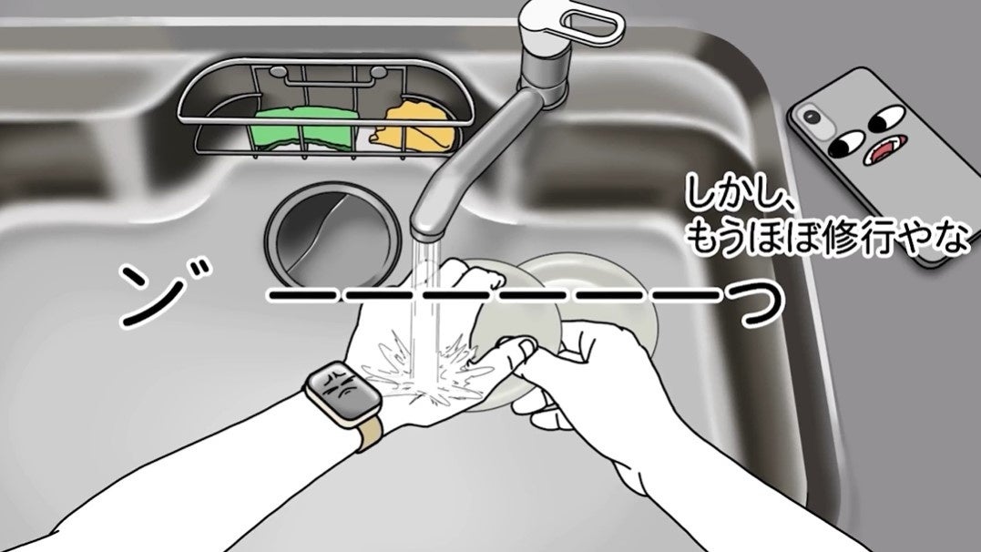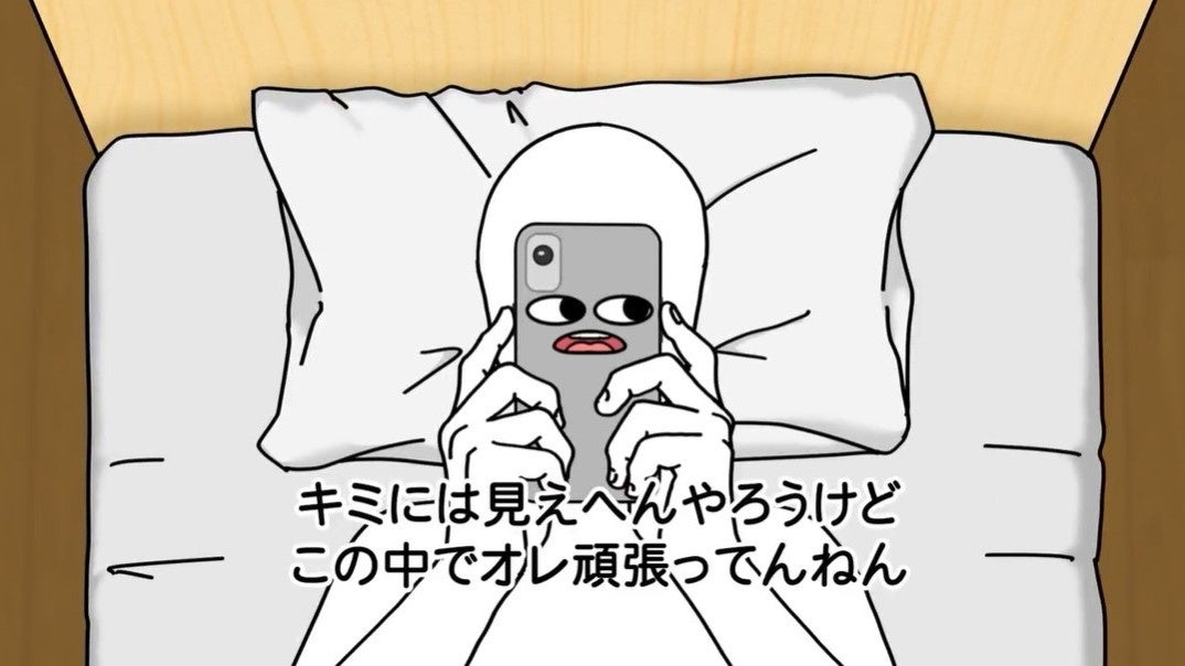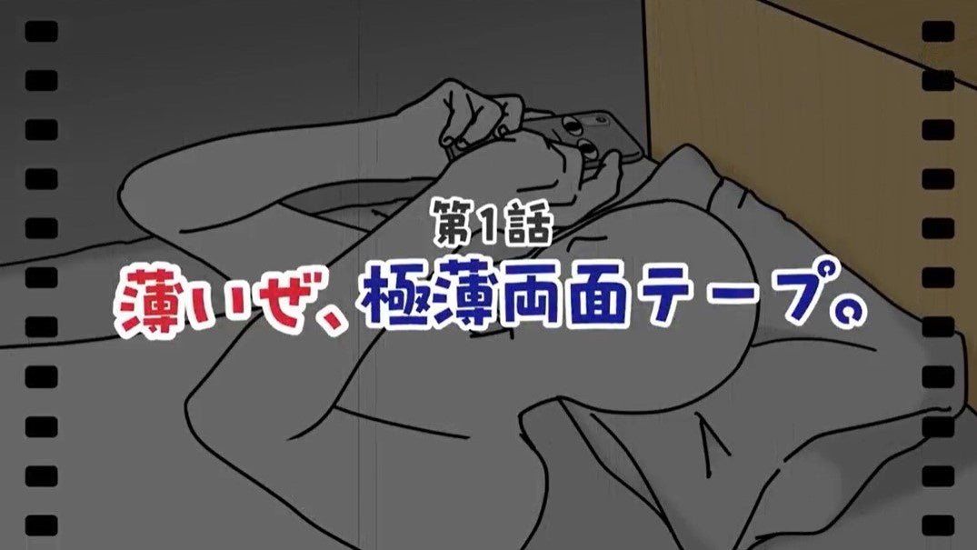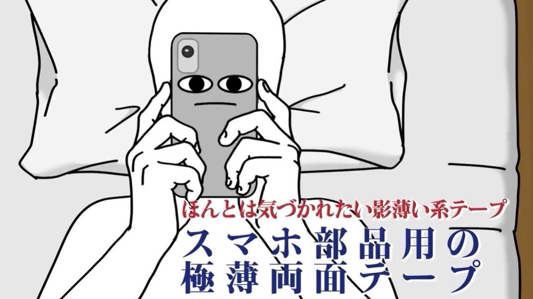 スマホの中でひっそりと活躍する“極薄両面テープ”が主人公。軽くて薄いスマホを支える縁の下の力持ちであるにもかかわらず、なかなか気づかれないことに不満を抱き、寝落ち寸前のユーザーに向かって必死に語りかけます。スクショ連打や誤送信など“寝ぼけあるある”を交えながら、テープの恩恵をユーモラスに訴えます。