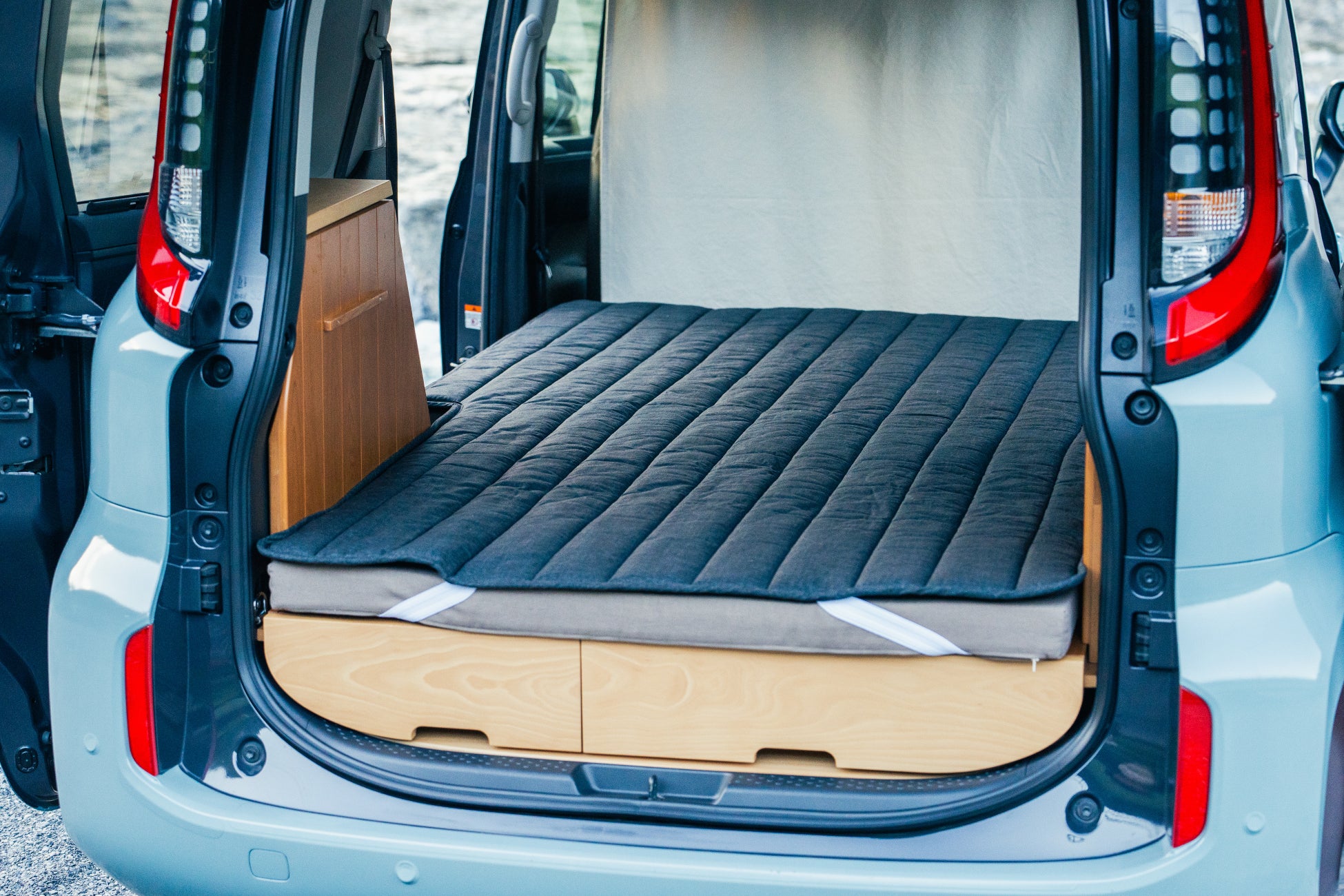 マットレスは分割式のため、車内にぴったりと敷き詰められるだけでなく、寝る時以外は邪魔になってしまいがちなマットレスを重ねてソファのように使うことが可能です。また、乗用車モードでも荷室に重ねてぴったりと収納できるように設計しています。マットレスの中材には「へたりにくい」「蒸れにくい」「軽量」「体圧分散」が特徴のテイジンのV-Lap(R)を使用しており、より長くより快適な車中泊を実現します。