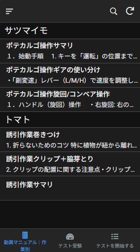 熟練者の技術(例:トマトの脇芽かき、サツマイモ収穫機のハンドル操作等)を言語化・映像化し、10秒動画+多言語音声(インドネシア語等)で提供します。スマホ一つで直感的に理解できる学習環境を整備し、指導コストを削減しながら作業品質を均質化します。