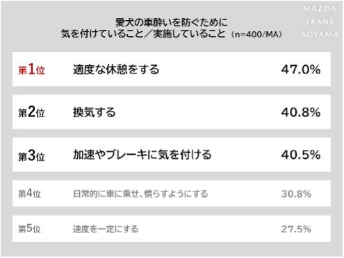 ドライバーが愛犬の車酔いを防ぐために実践していることとして、最も多かったのは「適度な休憩を取ること」(47.0%)でした。その他にも、「加速やブレーキに気を付ける」(40.5%)「速度を一定にする」(27.5%)など、日々の運転動作の中でできる工夫を挙げる人も多く見られました。
