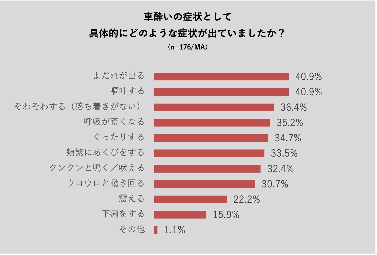 愛犬の車酔い経験について尋ねたところ、44%が「ある」と回答。その際に見られた主な症状としては、「よだれを垂らす」(40.9%)、「嘔吐する」(40.9%)、「落ち着きがなくなる/ソワソワする」(36.4%)などが多く挙がり、いずれも3割以上の回答者が複数該当しています(複数回答)。