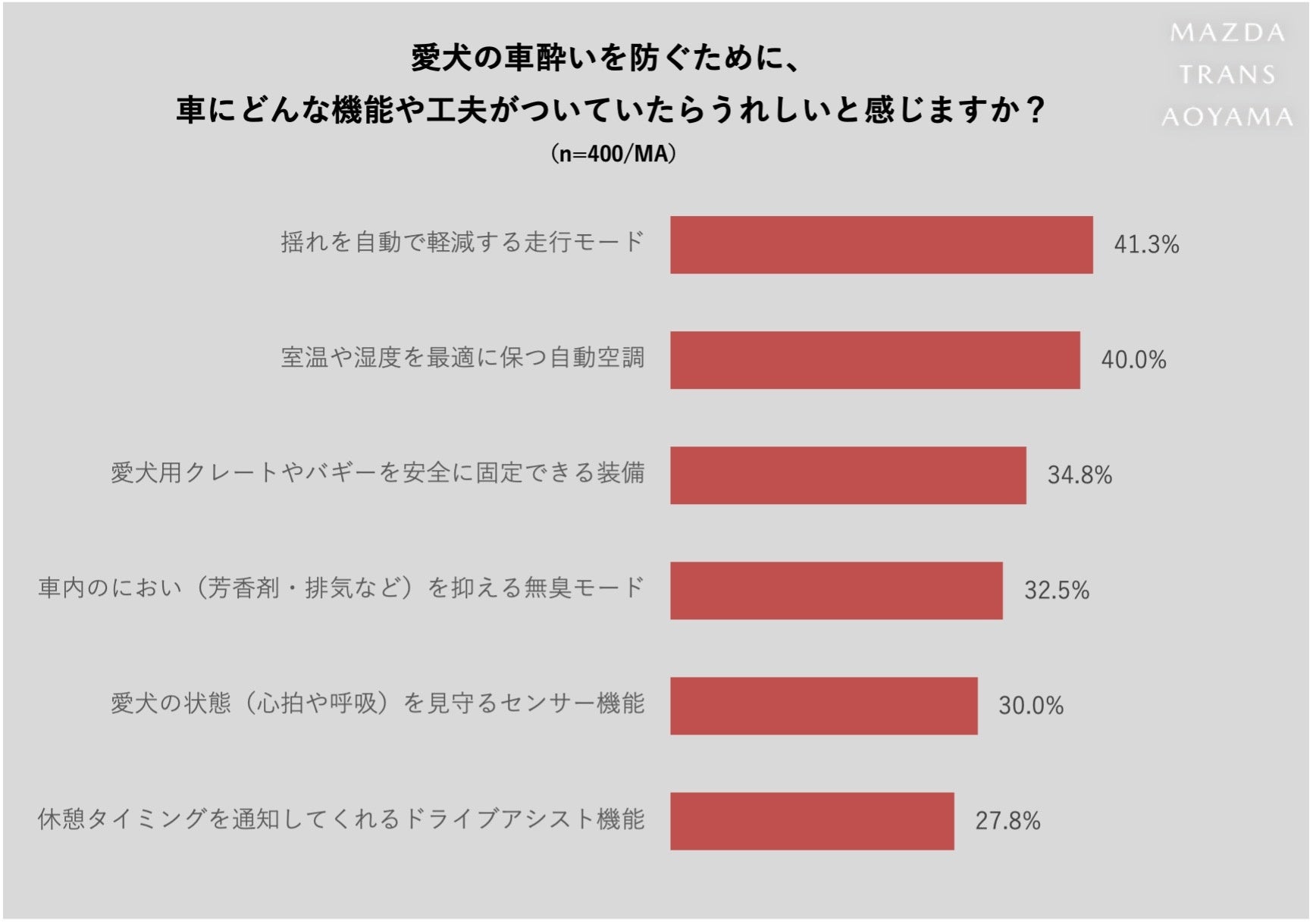 こうした誤った対処は、愛犬にとってかえって負担となる可能性があるため、ドライバーには正しい知識を身につけることが求められます。さらに、車酔いを防ぐために車についていたら嬉しい機能としては、「揺れを自動で軽減する走行モード(41.3%)」「室温や湿度を最適に保つ自動空調(40.0%)」が上位に。ドライバー自身の努力だけでなく、車側のサポート機能へのニーズも高まっていることが分かりました。