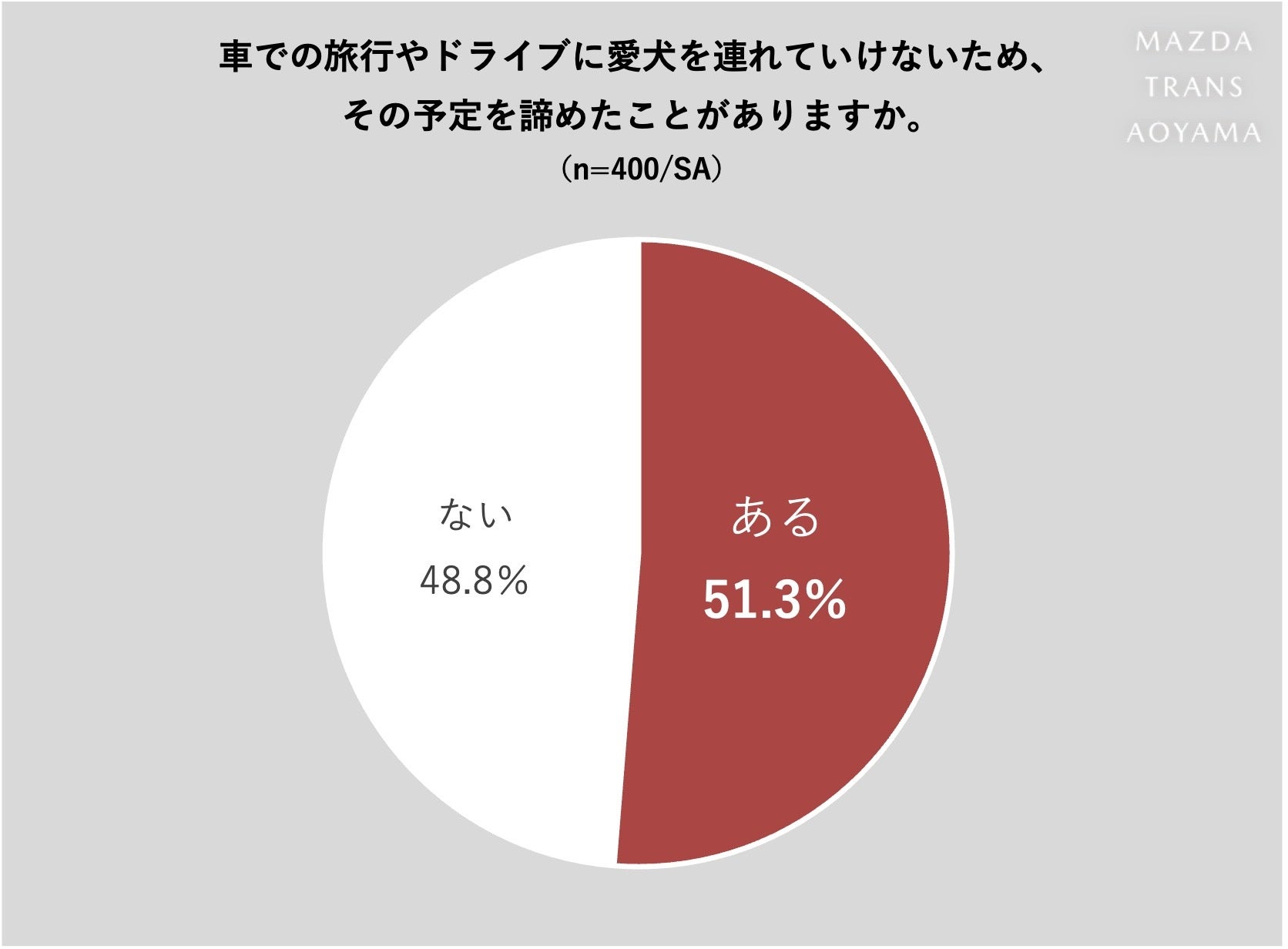 3. 愛犬を旅行やドライブに連れていけないため、遠出を諦めた人は2人に1人。その理由として「愛犬がストレスを感じそうだった」とあげる人が数多くみられた。