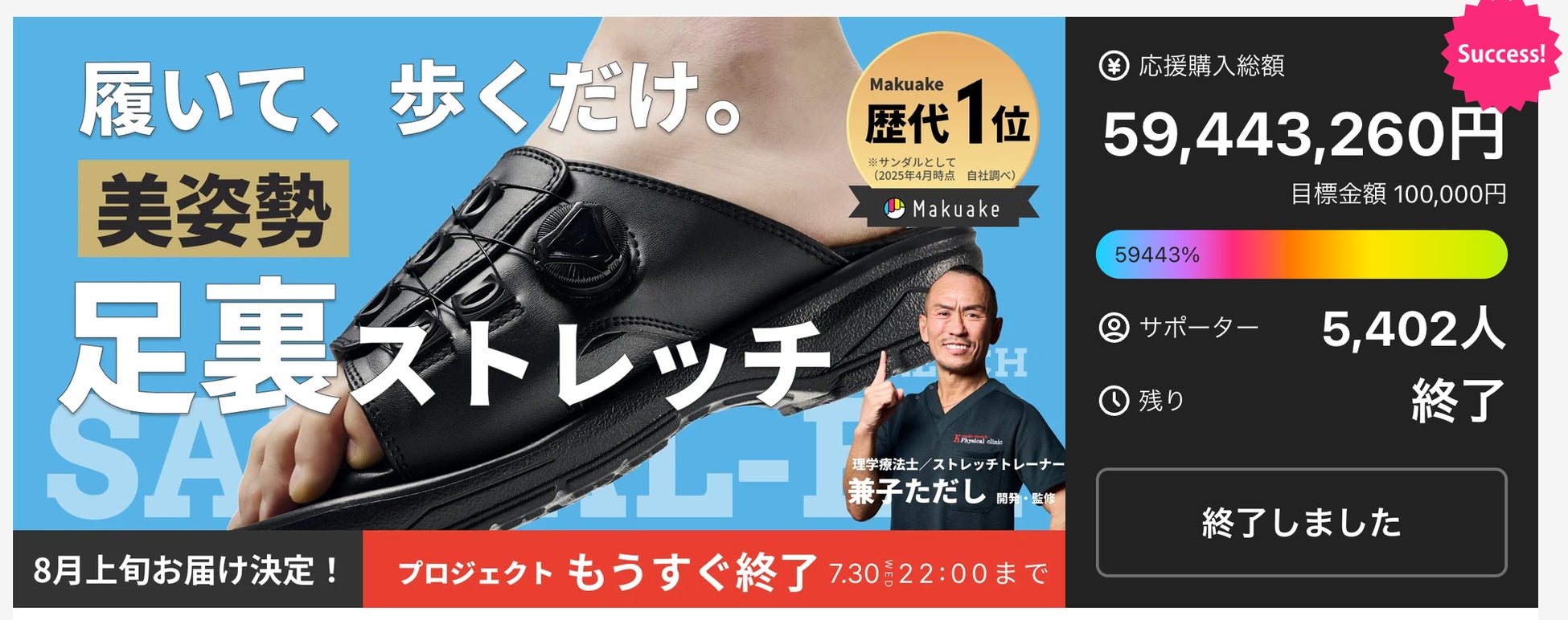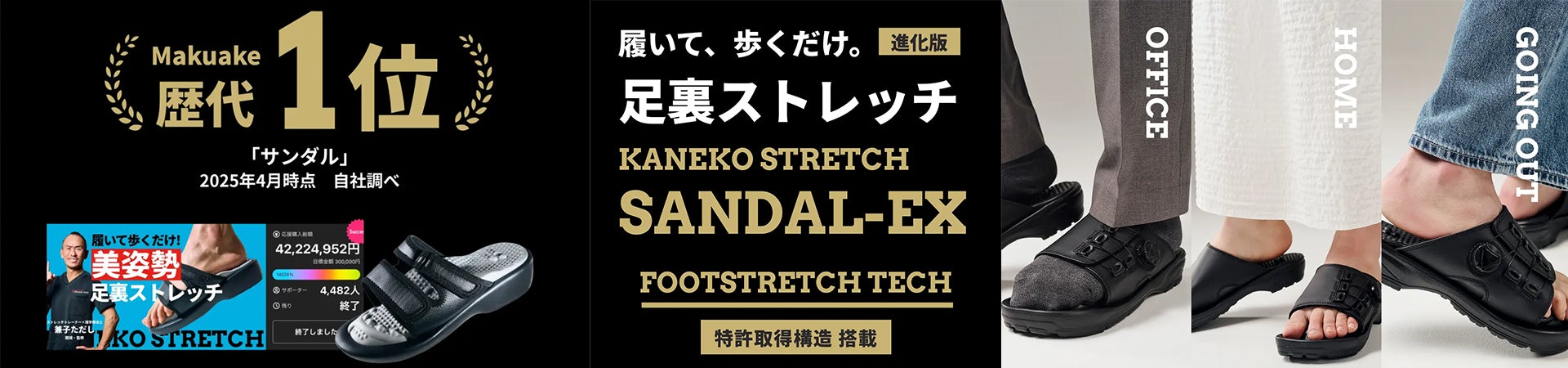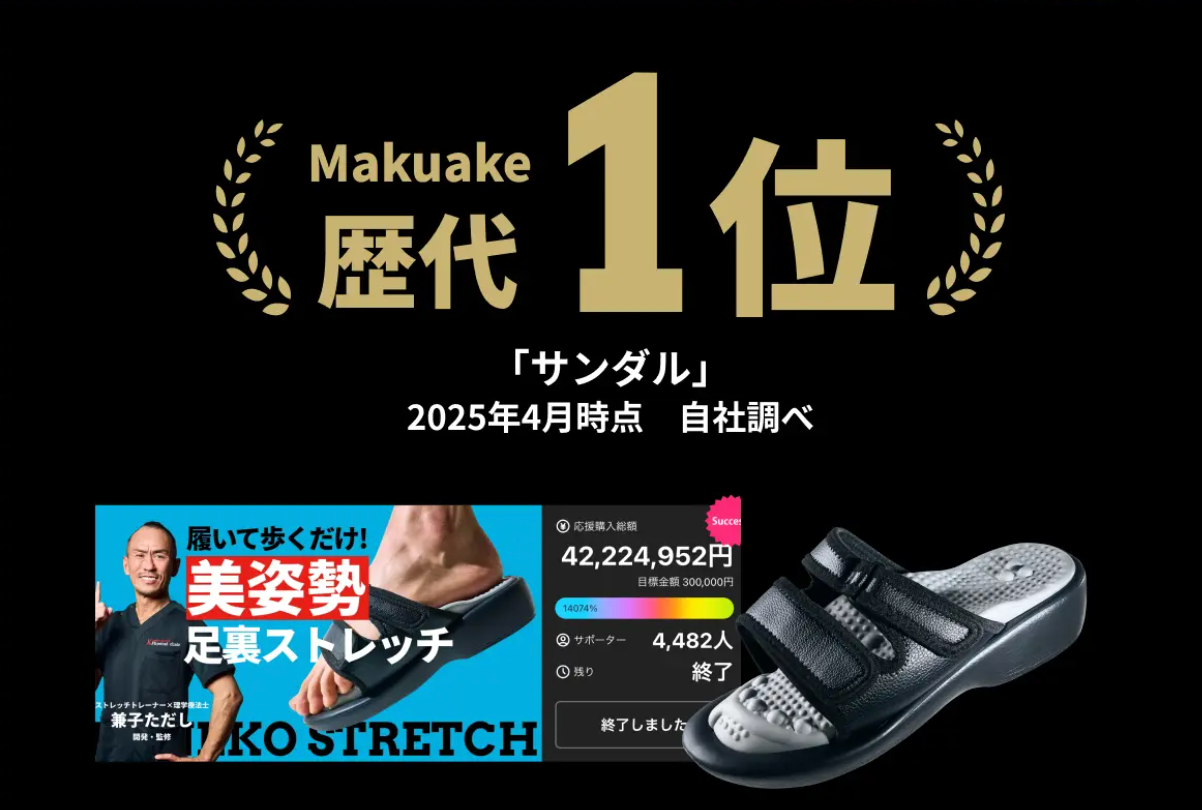 株式会社KANEKO(本社:東京都中央区/代表取締役:兼子ただし)が開発・監修した「兼子ただし監修ストレッチサンダルEX」が、応援購入サービスMakuake(マクアケ)にて2025年5月17日から発売され、わずか5日間で2,400万円を売り上げ、最終的に約6,000万円を記録しました。