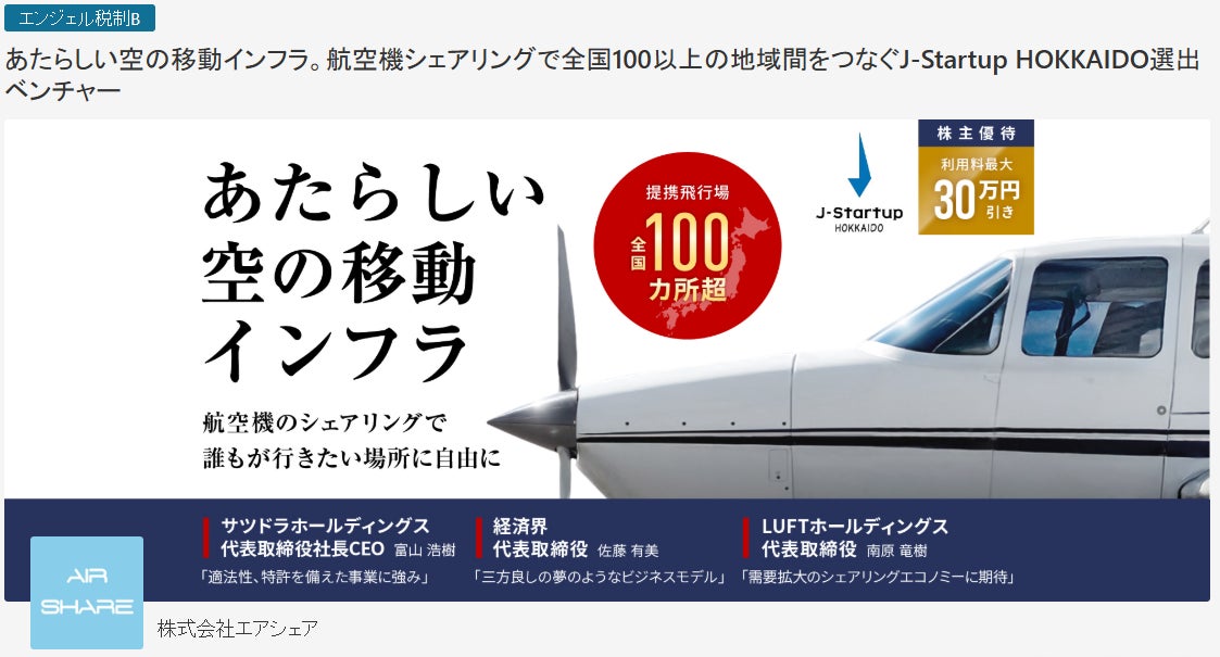 日本初の航空機シェアリングサービス「AIR SHARE」を運営する株式会社エアシェアは、株式投資型クラウドファンディング「FUNDINNO」を通じて、10月2日より募集を開始いたします。
