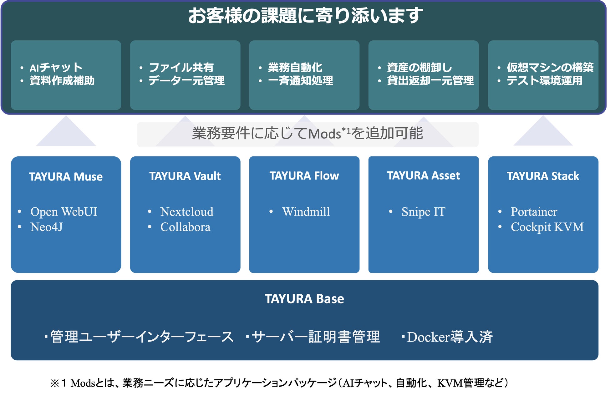 GUI管理が可能な「TAYURA Base」シリーズ提供開始 – OSSベースでニーズに応じて機能拡張できる「Mods」構成を採用 –