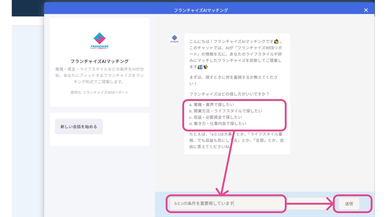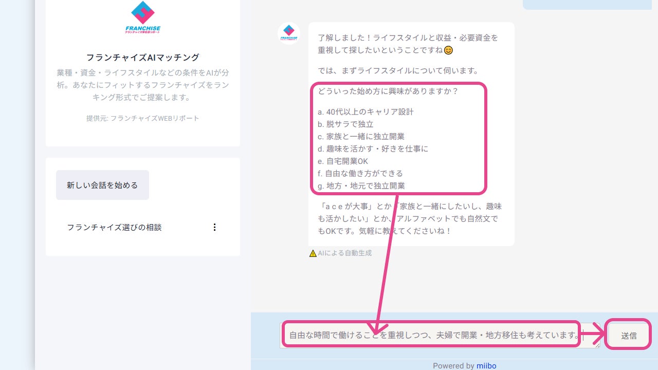 ユーザーは独立開業の希望条件や開業資金を自然文で入力するだけ。AIが最大3件のフランチャイズビジネスの候補と「なぜマッチするのか」の根拠を添えて最適なビジネスを提案します。