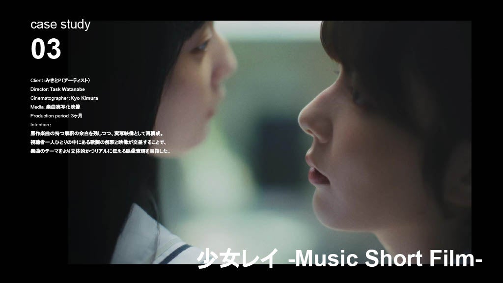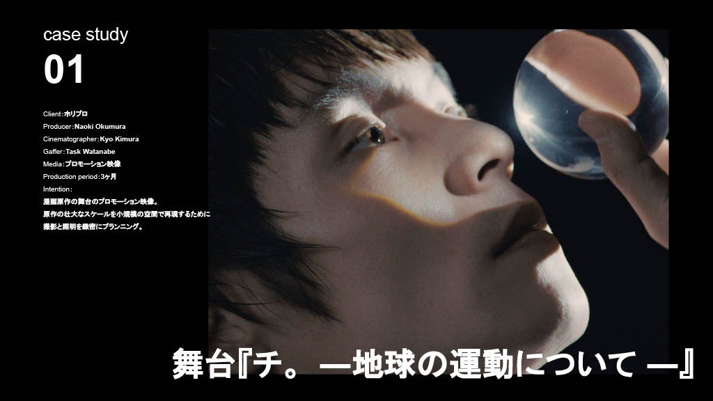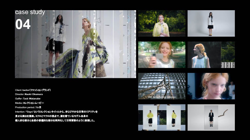 広告制作においても、舞台『チ。 ―地球の運動について―』PVやファッションブランド『tactor』のコレクションムービーなど、表現の枠を越えた案件を多数手がけています。