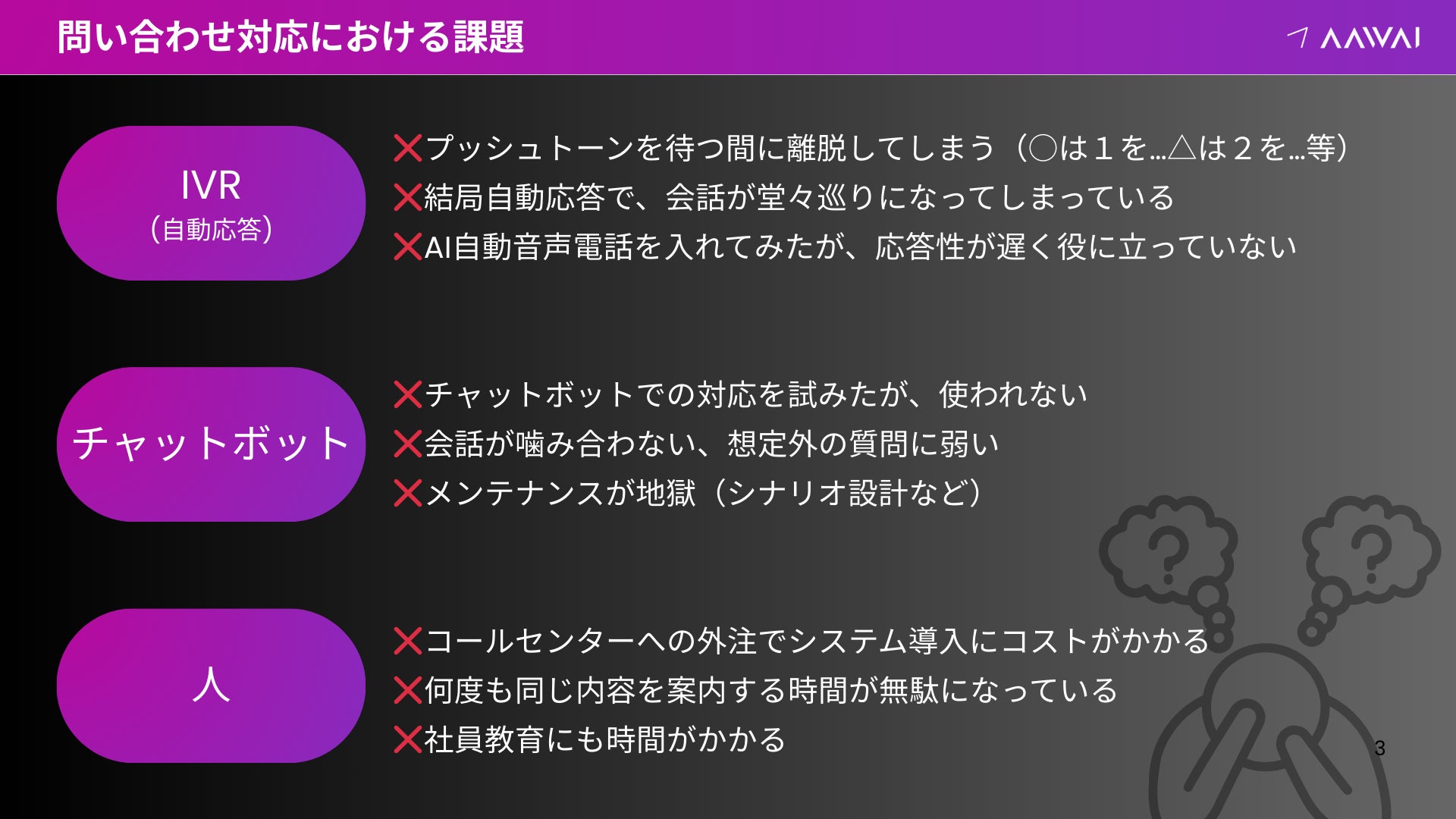 AAWAIはこの常識に対し、電話業務そのものをAIが担う「AIコール」という新しい解決策を提供します。