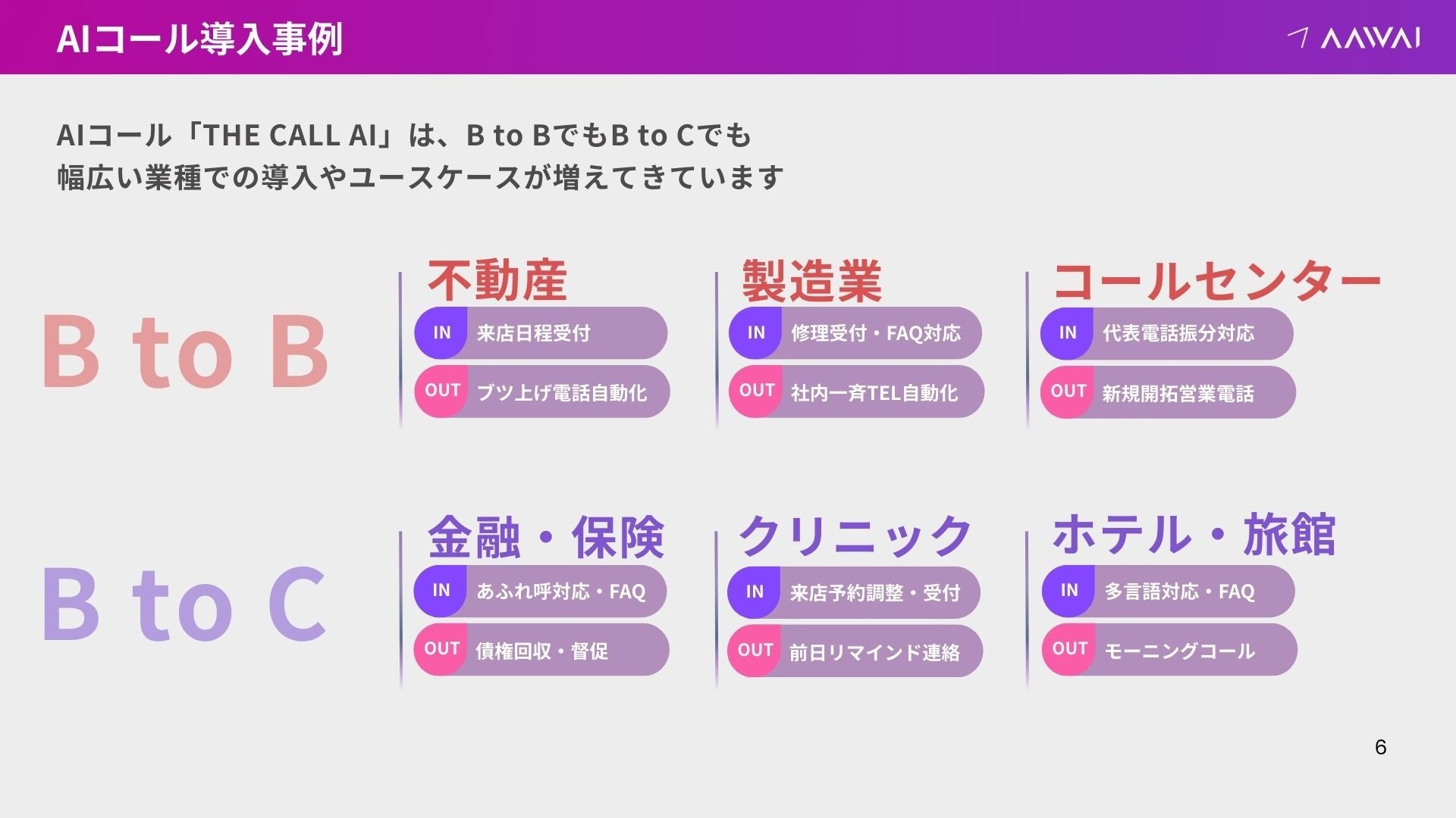 AAWAI株式会社(本社:東京都渋谷区、代表取締役:村澤 秀明)は、AIによるリアルタイム音声処理で電話の受発信を完全自動化するAIコール「THE CALL AI」の提供を開始しました。