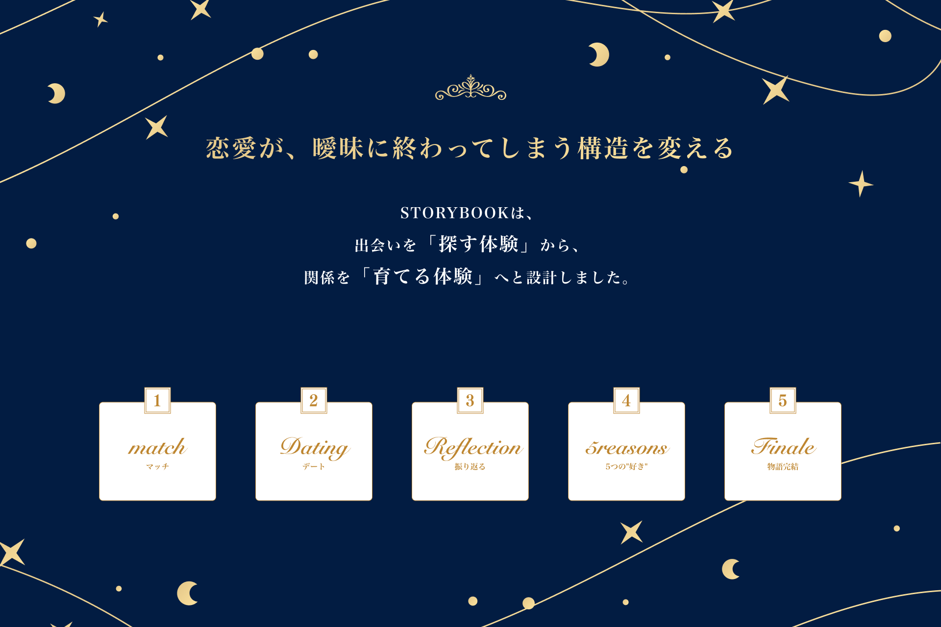 STORYBOOKは、夢や価値観を起点に、出会いから交際までの関係を5つの章として段階的に進める“物語進行型”の恋愛体験を提供します。