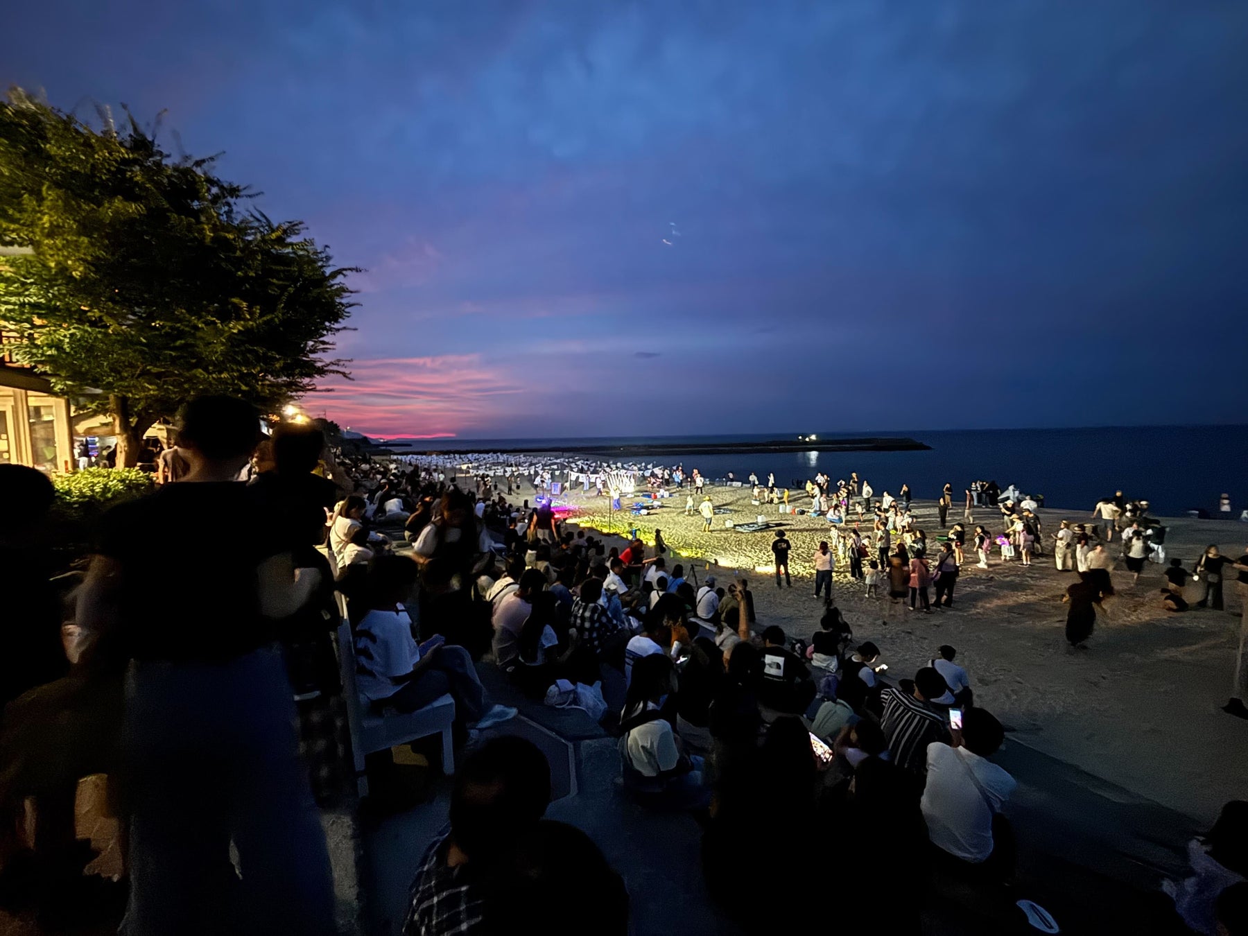 花火は、夜空と海面をダイナミックに彩る演出で、観覧場所として人気の高い「恋人岬」を挟む東西の堤防から、左右に広がる壮大なパノラマ花火をお楽しみいただきました。また、花火の打ち上げ前には、地元小・中学校による演奏や合唱、約40店舗が出店するフードブースなど、花火を待つ時間も楽しんでいただきました。