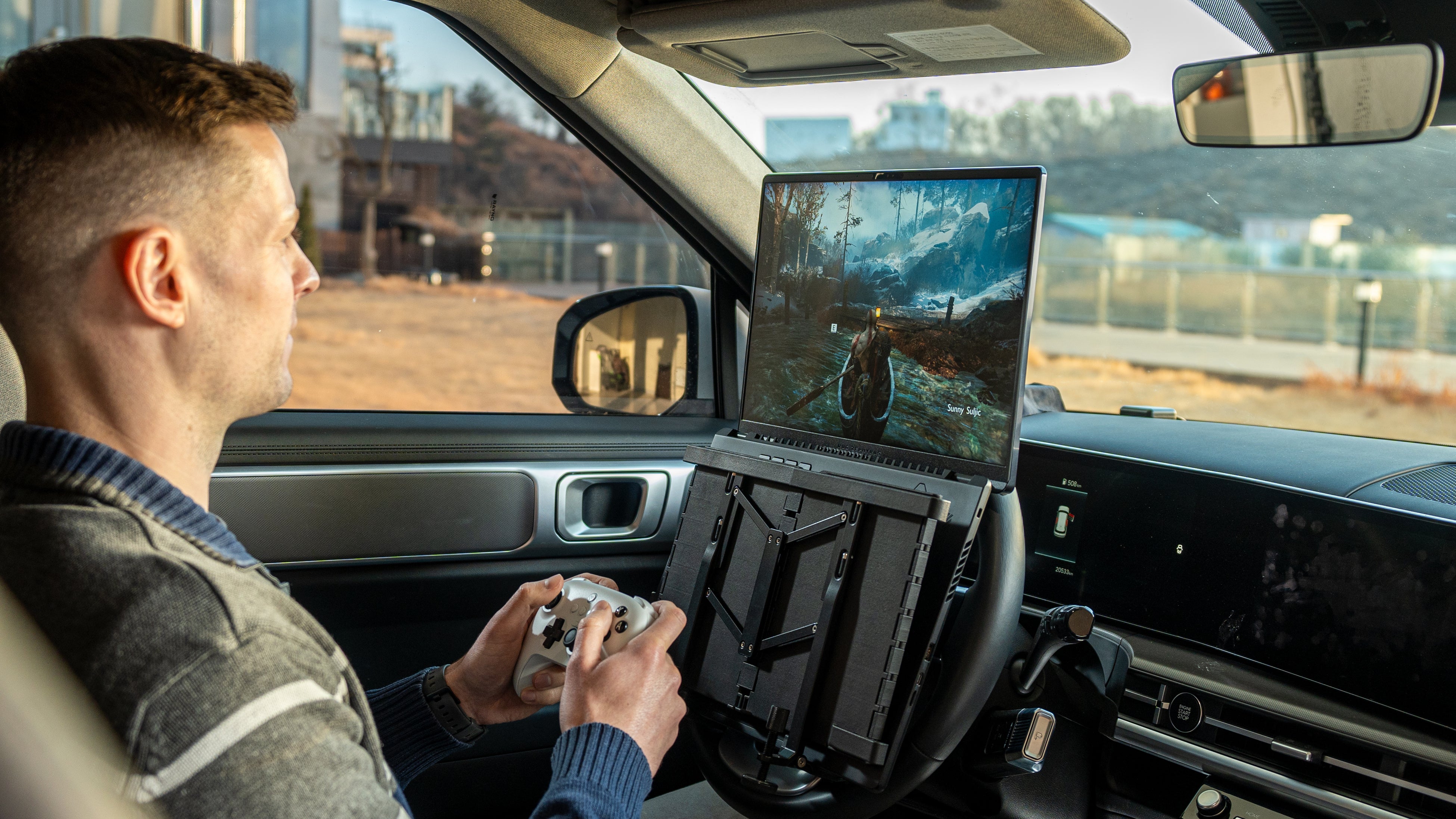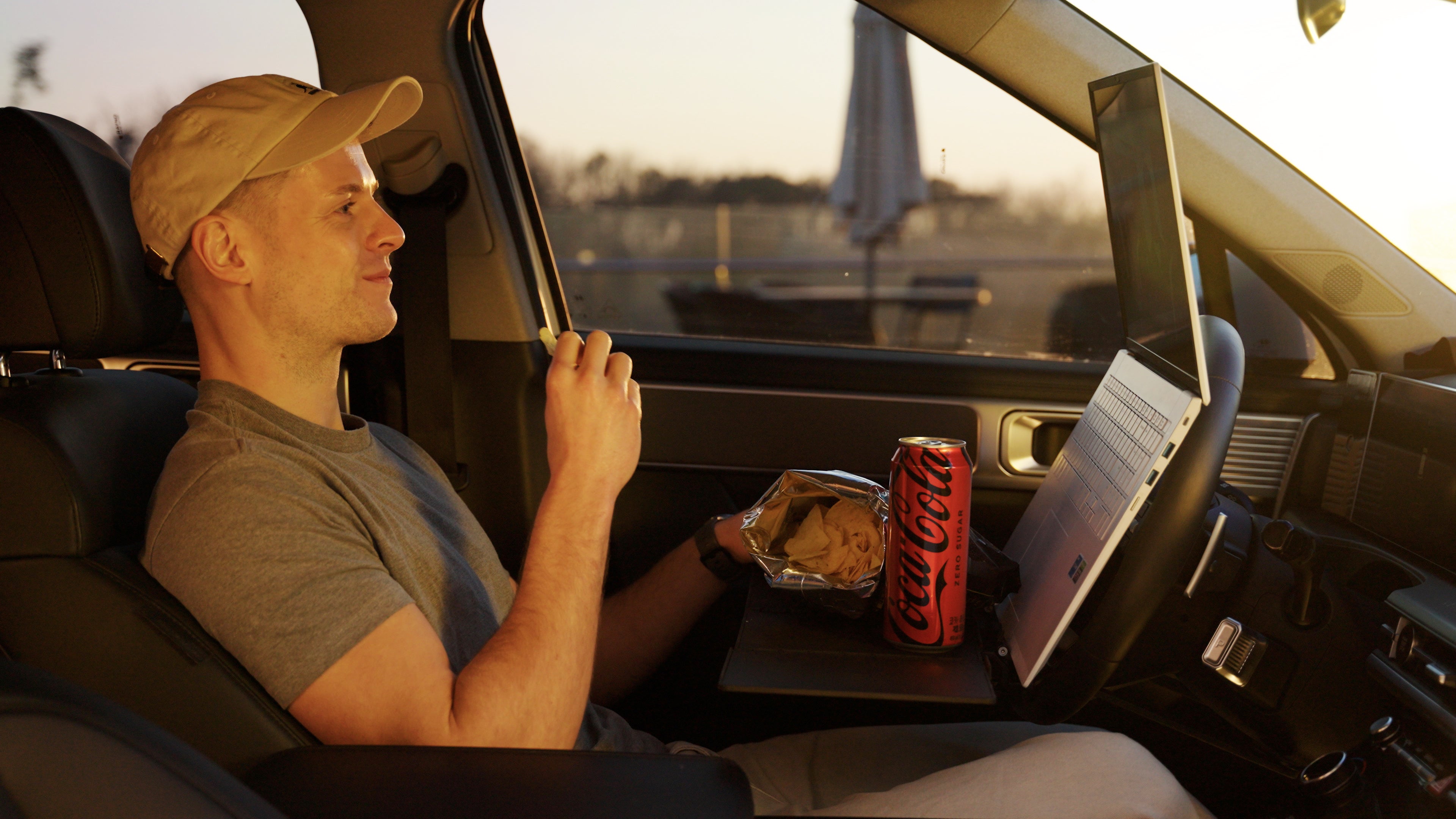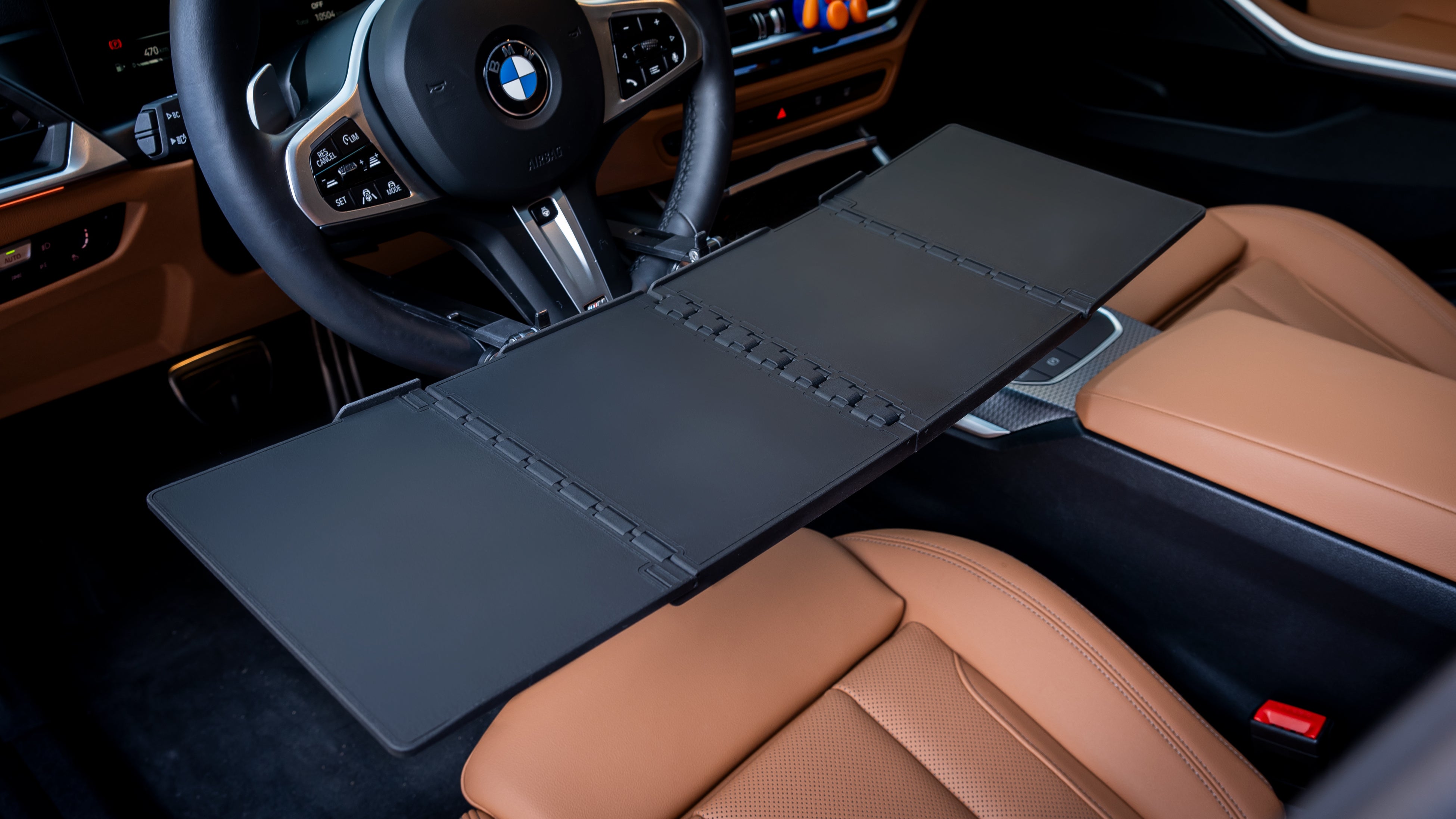 全車種対応!車のハンドルに取り付け可能な「車内テーブルCaro」。いつもの車を移動するオフィス&リビングに。海辺の駐車場でテレワーク、車内ナイトシアター等、新しいライフスタイルが広がります!