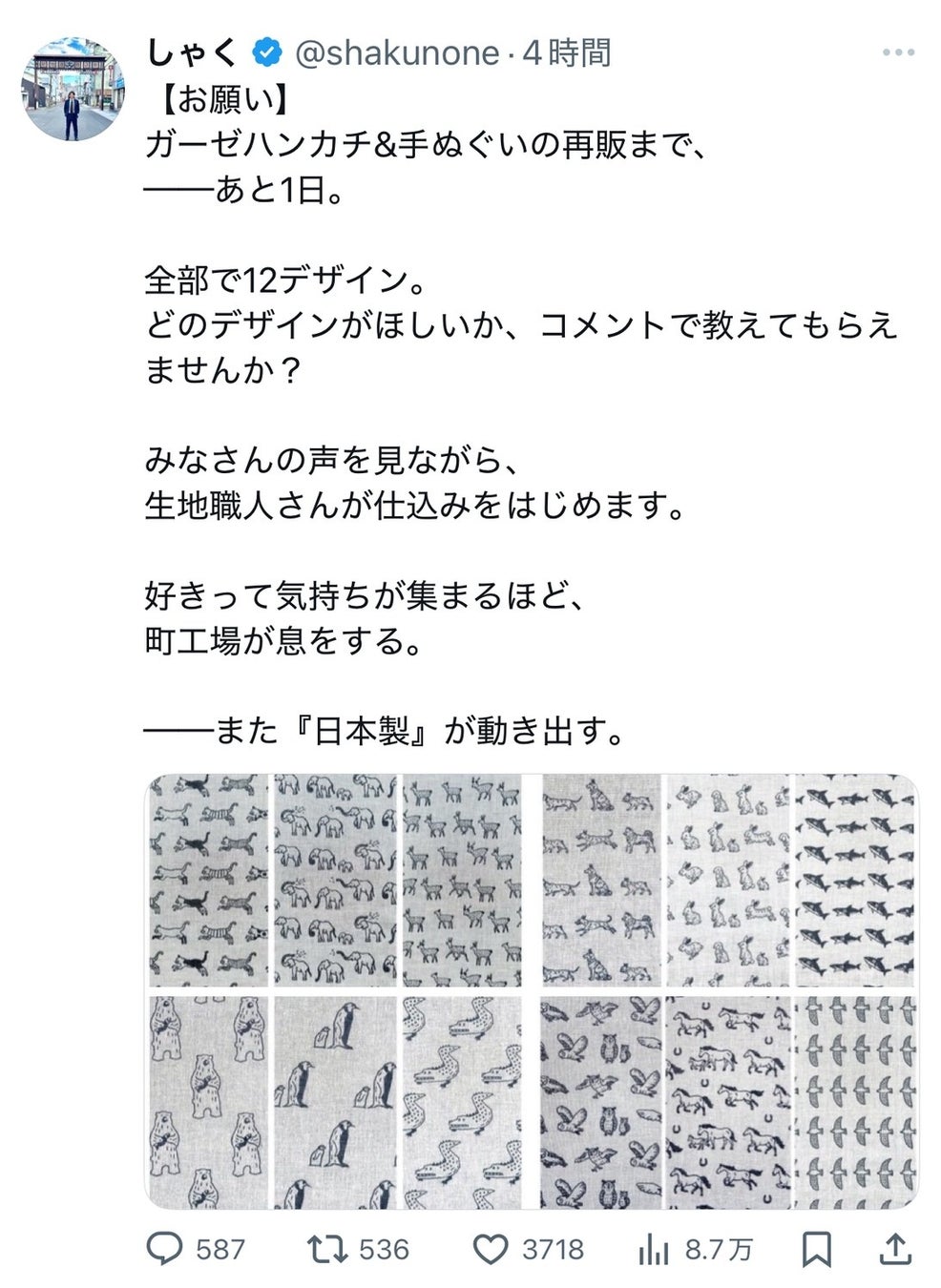 自分たちの仕事を「知ってほしい」の一心で、2015年に下請の縫製 工場から自社ブランド「SHAKUNONE(シャクノネ)」を設立。 ブランド立ち上げ前からの約11年間、延べ4000日以上、1日も欠か さずSNSでの発信を続けてきた中で、工場や商品をSNSで紹介して いると、全国から温かい声が届くようになりました。