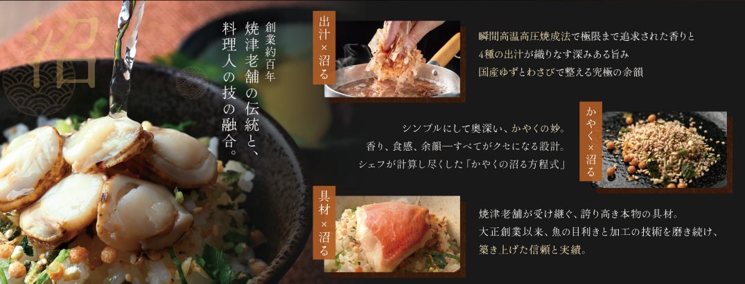 笠原シェフと焼津老舗の技術が融合し、“出汁×かやく×具材”の三位一体で生まれた究極のお茶漬け。