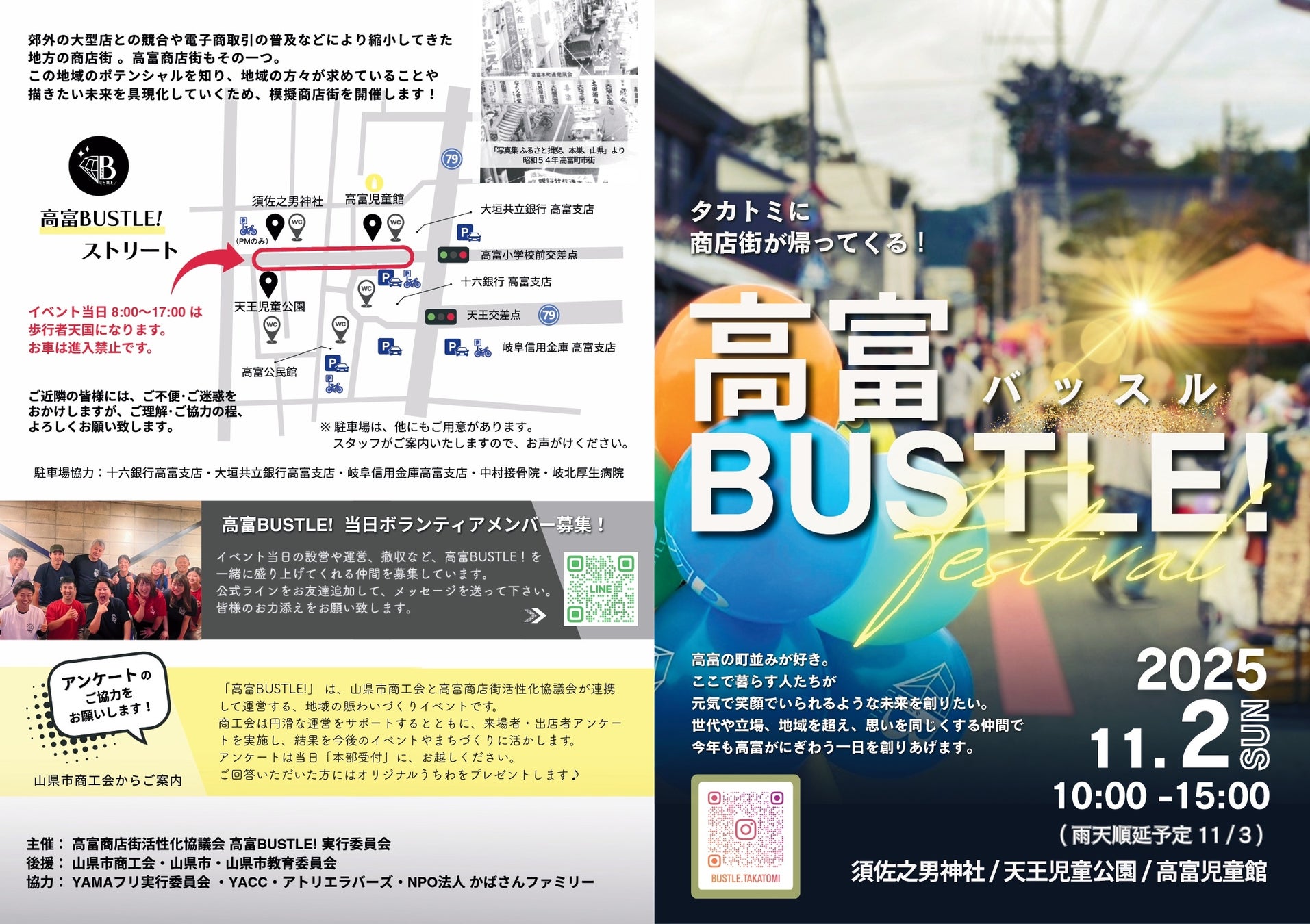 高富商店街活性化協議会 高富BUSTLE!実行委員会(委員長 田崎 豪 以下 当会)は、昨年3,000人の来場者で大いに賑わった歩行者天国イベント『高富BUSTLE!(バッスル)』を以下の通り開催します!