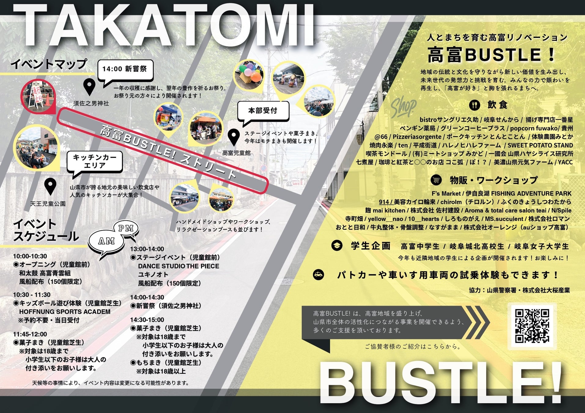 当会は、商店街のリノベーションを通じて、高富地区に賑わいを復活させようと、昨年地元有志や市商工会等で結成しました。イベント当日は、約50の出店者やキッチンカーが神社前を彩る他、ダンスパフォーマンス等のステージイベントや近隣の中高大学生によるワークショップ、須佐之男神社「新嘗祭」等、多種多様な催しが実施されます。イベントの最後には、大人気の菓子まきや餅まき等も盛大に行います!