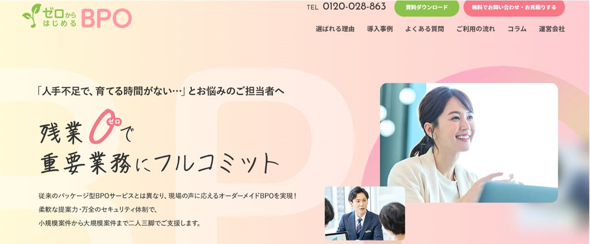 「ゼロからはじめるBPO」では、これから初めてBPOに取り組む企業の現状の分析・業務改善から二人三脚で支援します。大手では難しい現場に寄り添った個別対応や柔軟な料金設定が特徴です。また、同じく「ゼロからはじめるRPA」サービスも展開しており、合わせて導入することで、効率的なDXを進めながらのBPOが可能となります。