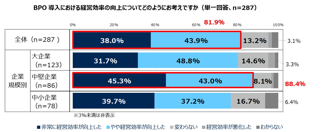 このような状況を背景に、業務の外部委託であるBPOが有効な解決策として注目されています。パーソルビジネスプロセスデザイン株式会社の調査では、BPOを導入した中堅企業の約9割が「経営効率が向上した」と回答しています。これは、BPOが単なるコスト削減にとどまらず、企業の生産性向上や経営改善に直結する戦略的な手段となっていることを示唆しています。