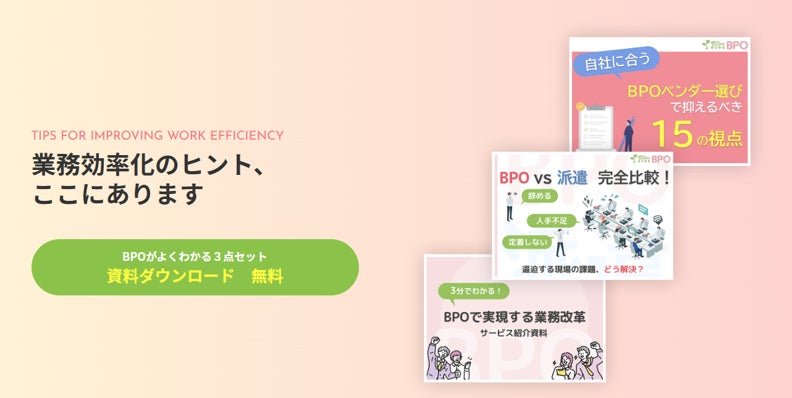 BPOを導入する際のさまざまな疑問を解消するためのホワイトペーパー3点をご用意しました。BPOの基礎知識から当社のサービスの特徴、人材派遣との違いやBPOベンダー選びのチェックリストまで、BPO導入を検討するご担当者にはぜひ参考にしていただきたい内容です。