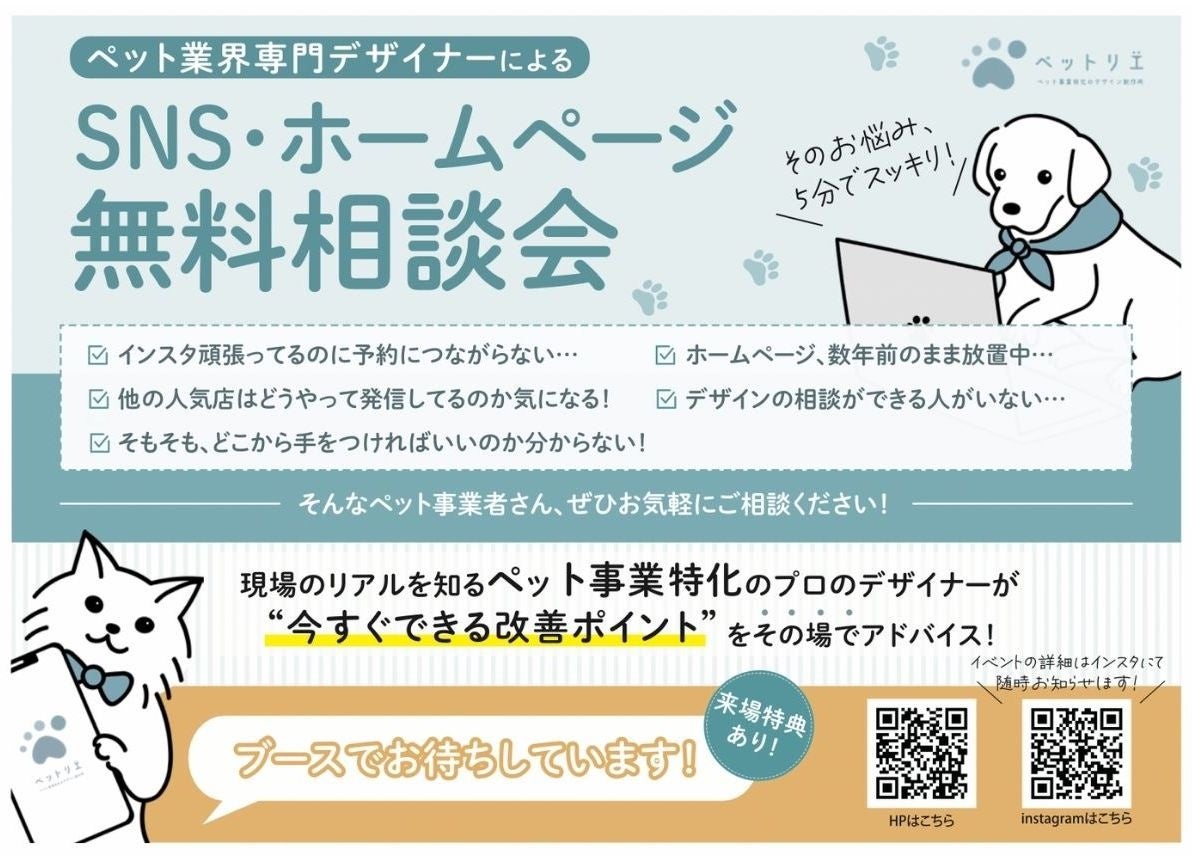 本展示会では、PETポチッととペットリエのコラボ企画として「SNS・ホームページ無料相談会」を実施いたします。
