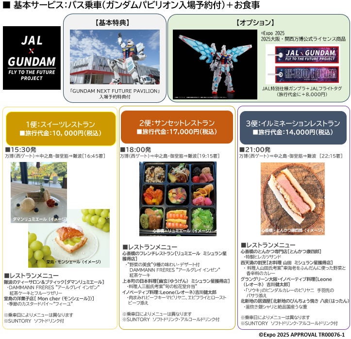 日本航空株式会社(本社:東京都品川区、代表取締役社長 グループCEO:鳥取 三津子、以下「JAL」)は、2025年9月5日(金)から10月13日(月)までの間、「GUNDAM NEXT FUTURE PAVILION」入場予約特典付きJAL×ガンダム レストランバス (*2) を大阪・関西万博の会場である夢洲(ゆめしま)から大阪市内まで1日3便運行します。本企画は「JAL×GUNDAM FLY TO THE FUTURE PROJECT」 (*1) の一環として企画され、3月の和歌山県白浜、4~6月東京都内での運行につづき、第3弾となります。10月13日の万博閉幕まで残り2ヵ月を切り、ますます盛況が想定される中、夕方から夜にかけて混雑する帰りの時間帯に、開放的な車内空間で特別なメニューとともに快適にお帰りいただくことができます。