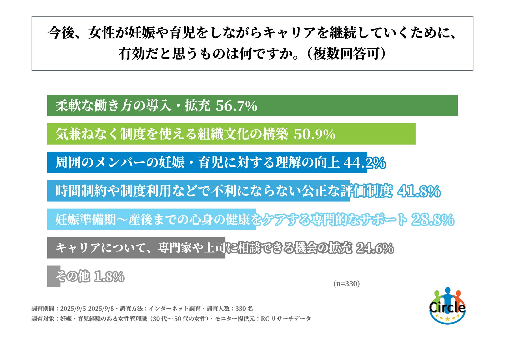調査の最後、「今後、女性が妊娠や育児をしながらキャリアを継続していくために、有効だと思うもの」を尋ねる設問への回答では、1位が「柔軟な働き方の導入・拡充」で56.7%、2位が「気兼ねなく制度を使える組織文化の構築」で50.9%、3位が「周囲のメンバーの妊娠・育児に対する理解の向上」で44.2%という結果になりました。この結果から、今後、女性が妊娠や育児をしながらキャリアを継続していくために、有効だと思うものは主に「柔軟な働き方の導入・拡充」や「気兼ねなく制度を使える組織文化の構築」であることが明らかになりました。