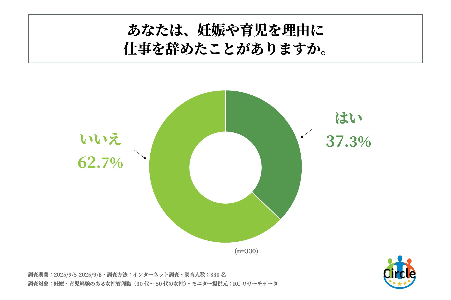 妊娠・育児経験のある30代~50代の女性管理職の4割弱が、妊娠や育児を理由に仕事を辞めたことがある