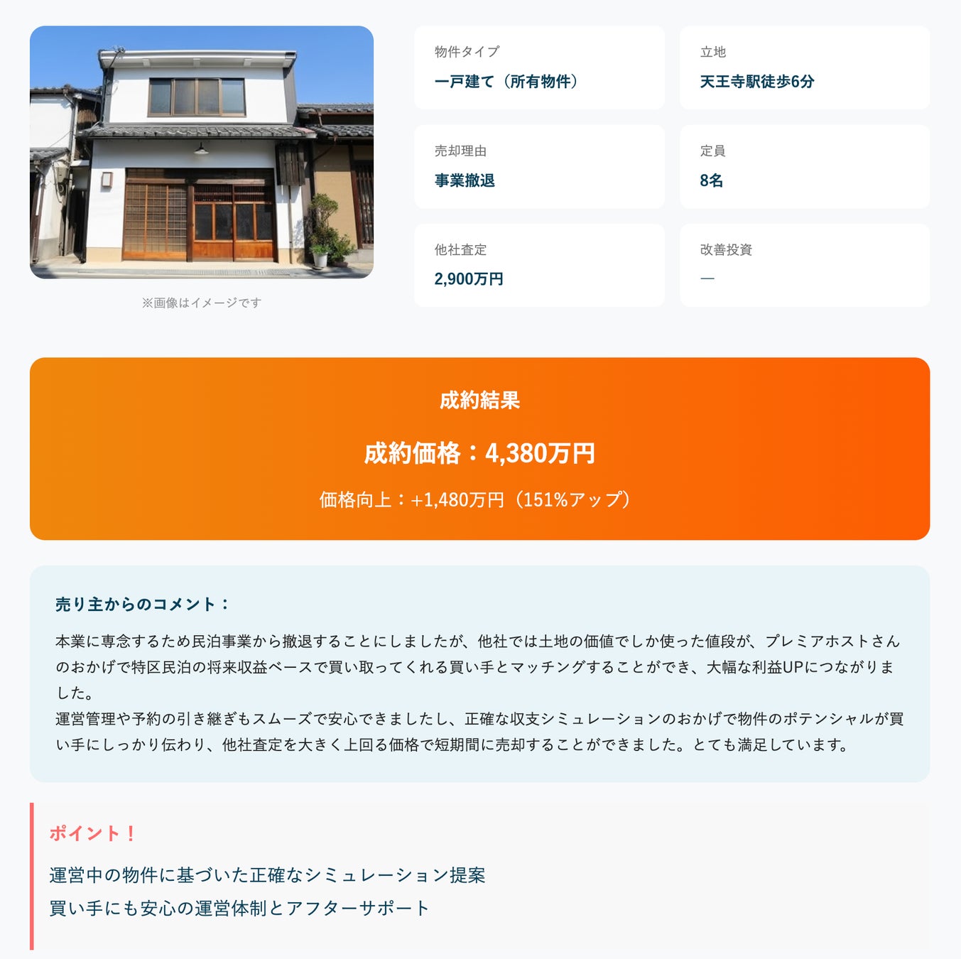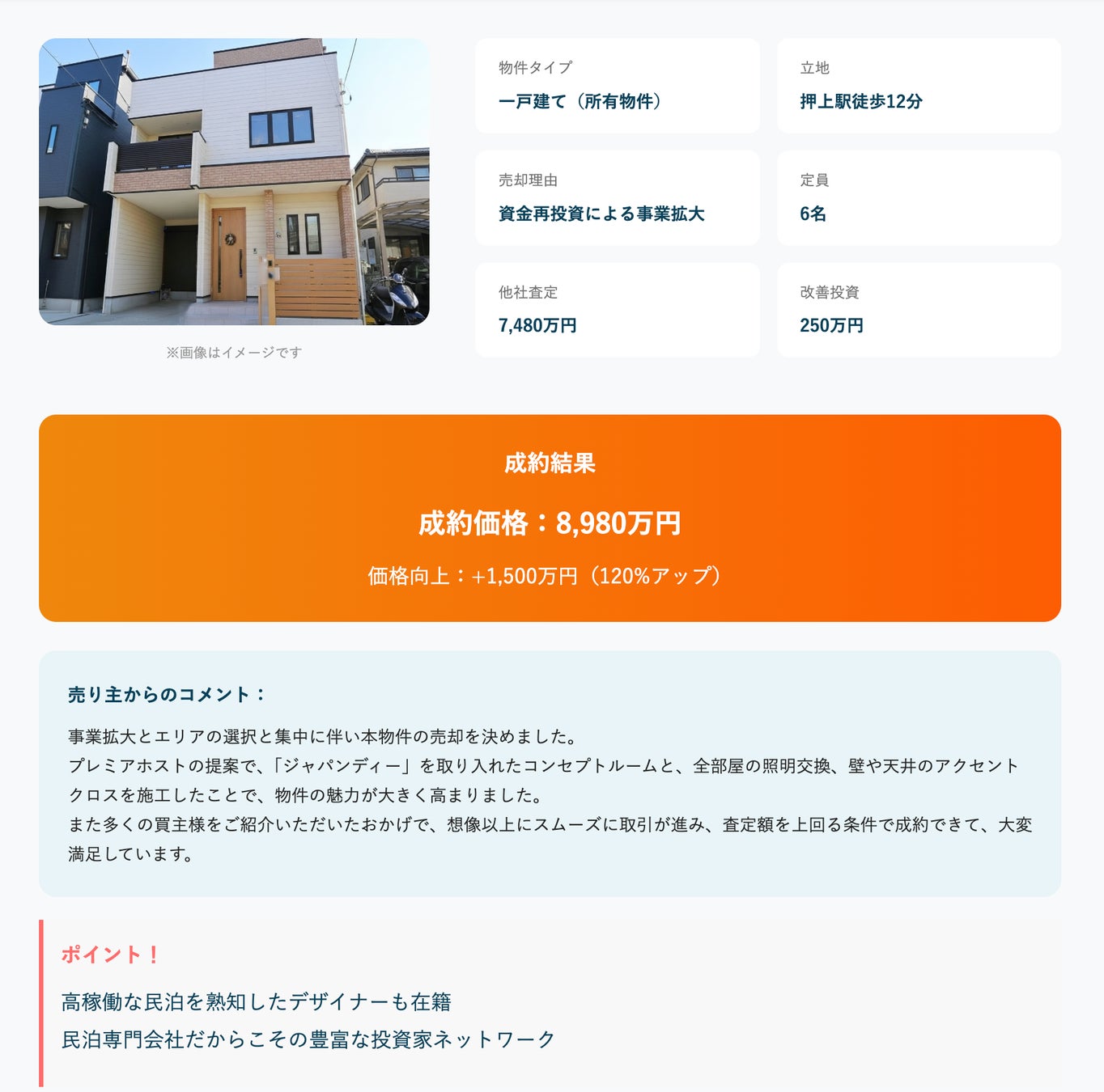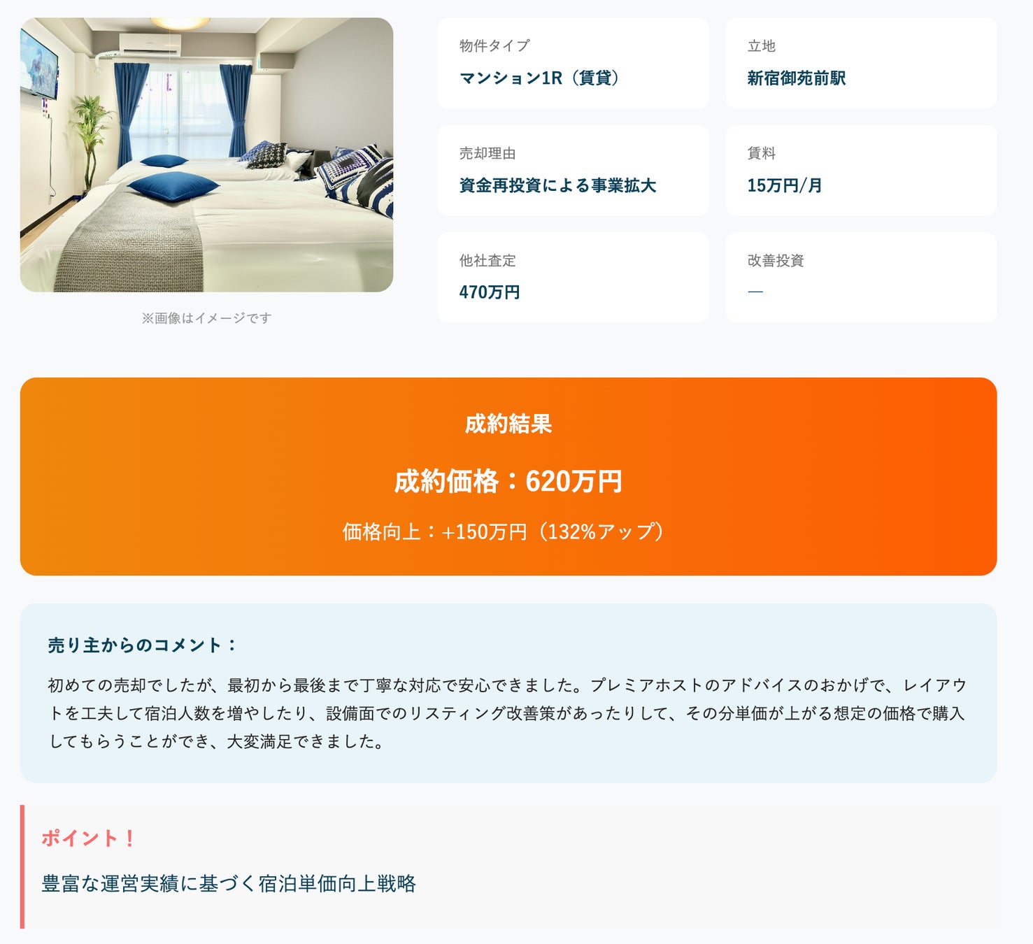 当社はこれまで、300室以上の運営・立ち上げを手がける民泊運営代行サービス 『PREMIER HOST』 を展開し、収益改善や宿泊単価向上に実績を積み重ねてきました。今回の『民泊M&Aプレミア』は、その豊富なデータとノウハウを基盤に、宿泊施設オーナーの潜在価値を最大限に引き出し、安心かつ高値での売却を可能にする新サービスです。