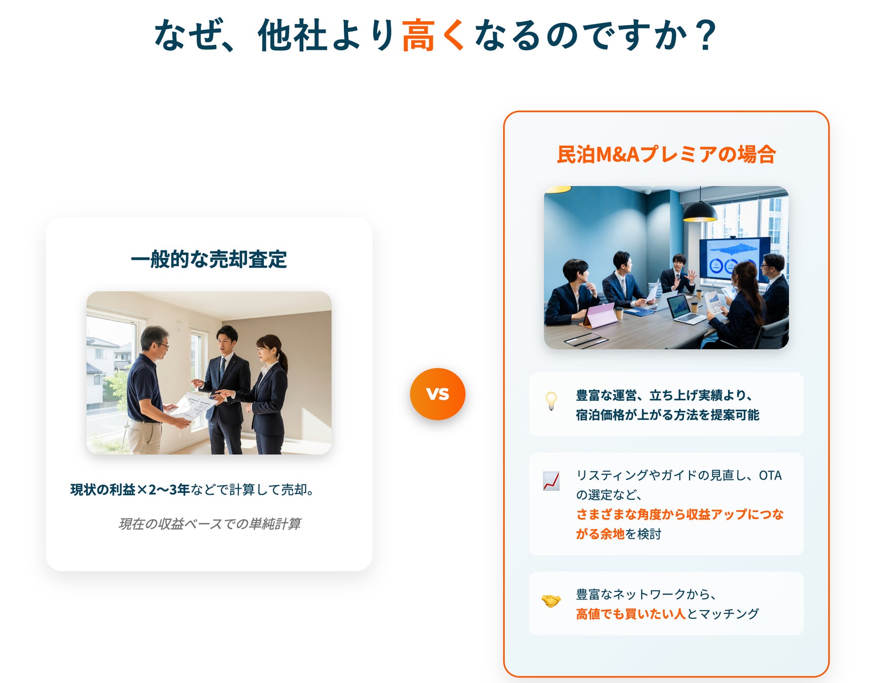 従来の「現状の利益×2~3年」で算出する一般的な査定方法に比べ、当サービスでは リスティング見直しやOTA選定など多角的な収益向上策 を提案し、物件の本当の価値を引き出します。さらに、豊富なネットワークによる「高値でも買いたい人」へのマッチングを実現します。