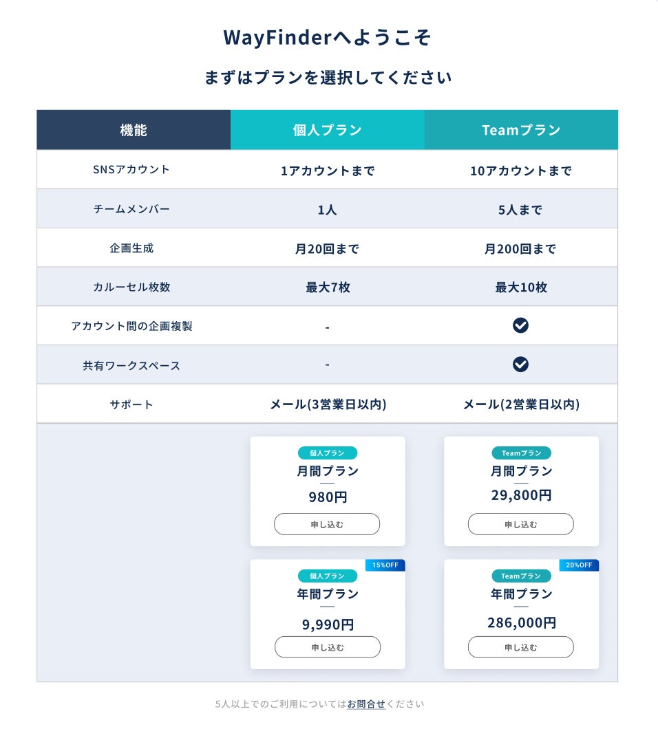 個人利用と法人利用の2種類のサービスを提供いたします。5名以上のチームでのご利用はカスタムプランとして個別での設定となります。