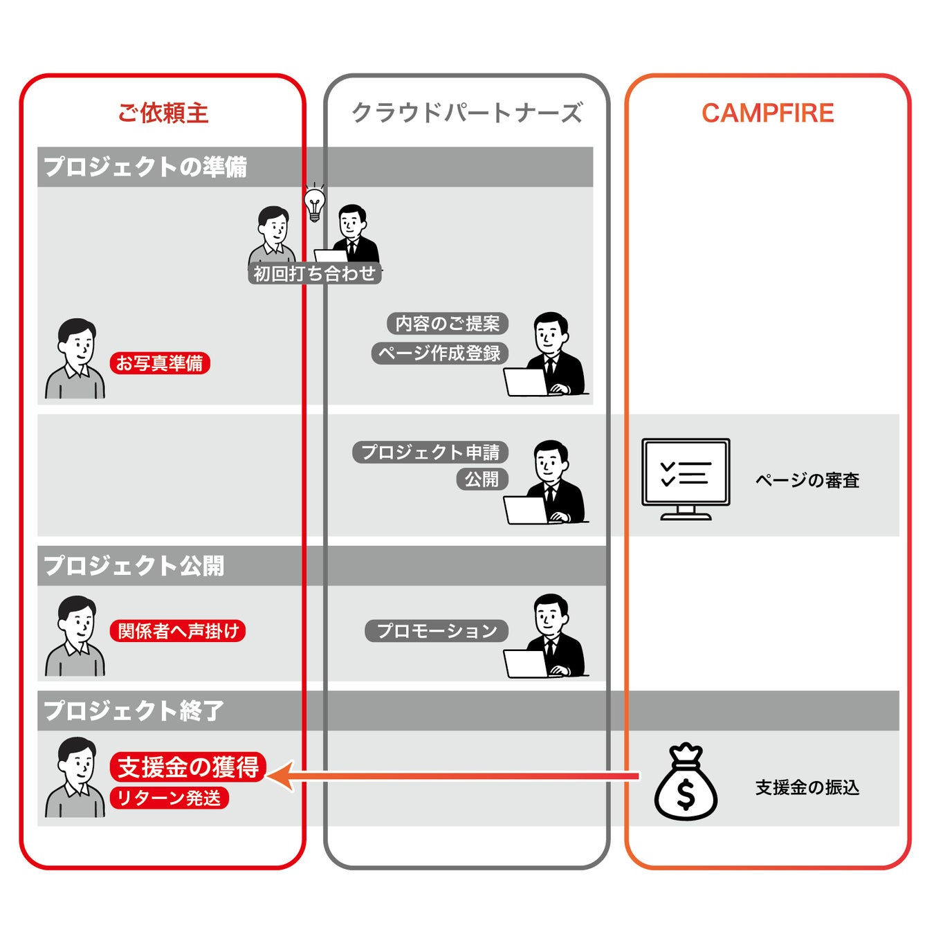 当サービスは、支援金を獲得できた場合にのみ発生する成果報酬型です。クラウドファンディング支援では、依頼主様からクラウドパートナーズにお支払いいただく費用は「支援金の10%」のみ。その他の「成功報酬型手数料+決済手数料(支援金の18.7%)」はCAMPFIREへのお支払いとなります。